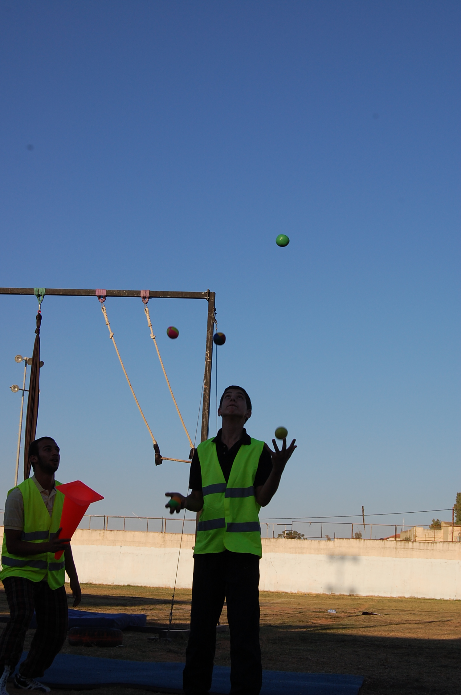 A colour photograph of the Palestine Circus School's production, "The Mobile Circus" in the Israeli-occupied city of Jenin in 2010. With a suite of training courses for all sections of society, the show featured a cast including, Ahmad Taleb, Alaʾ abu ar-Rub, Fady Zumurud, Hazar Azza, Laur Ṣadeq, Marah Ashmar, Mayrouby Makhluq, Muhammad abu ar-Rub, Muhammad abu Kishek, Muhammad abu Taleb, Muhammad al-Azza, Muhammad Ghayth, Muʿtaṣem Ghayth, and Yazan ʿWaydat.