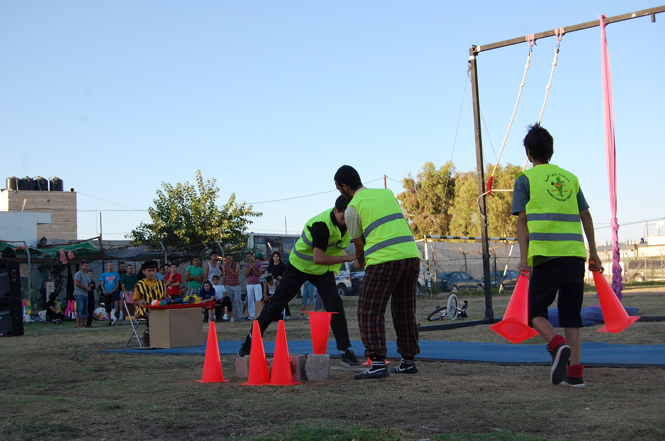 A colour photograph of the Palestine Circus School's production, "The Mobile Circus" in the Israeli-occupied city of Jenin in 2010. With a suite of training courses for all sections of society, the show featured a cast including, Ahmad Taleb, Alaʾ abu ar-Rub, Fady Zumurud, Hazar Azza, Laur Ṣadeq, Marah Ashmar, Mayrouby Makhluq, Muhammad abu ar-Rub, Muhammad abu Kishek, Muhammad abu Taleb, Muhammad al-Azza, Muhammad Ghayth, Muʿtaṣem Ghayth, and Yazan ʿWaydat.