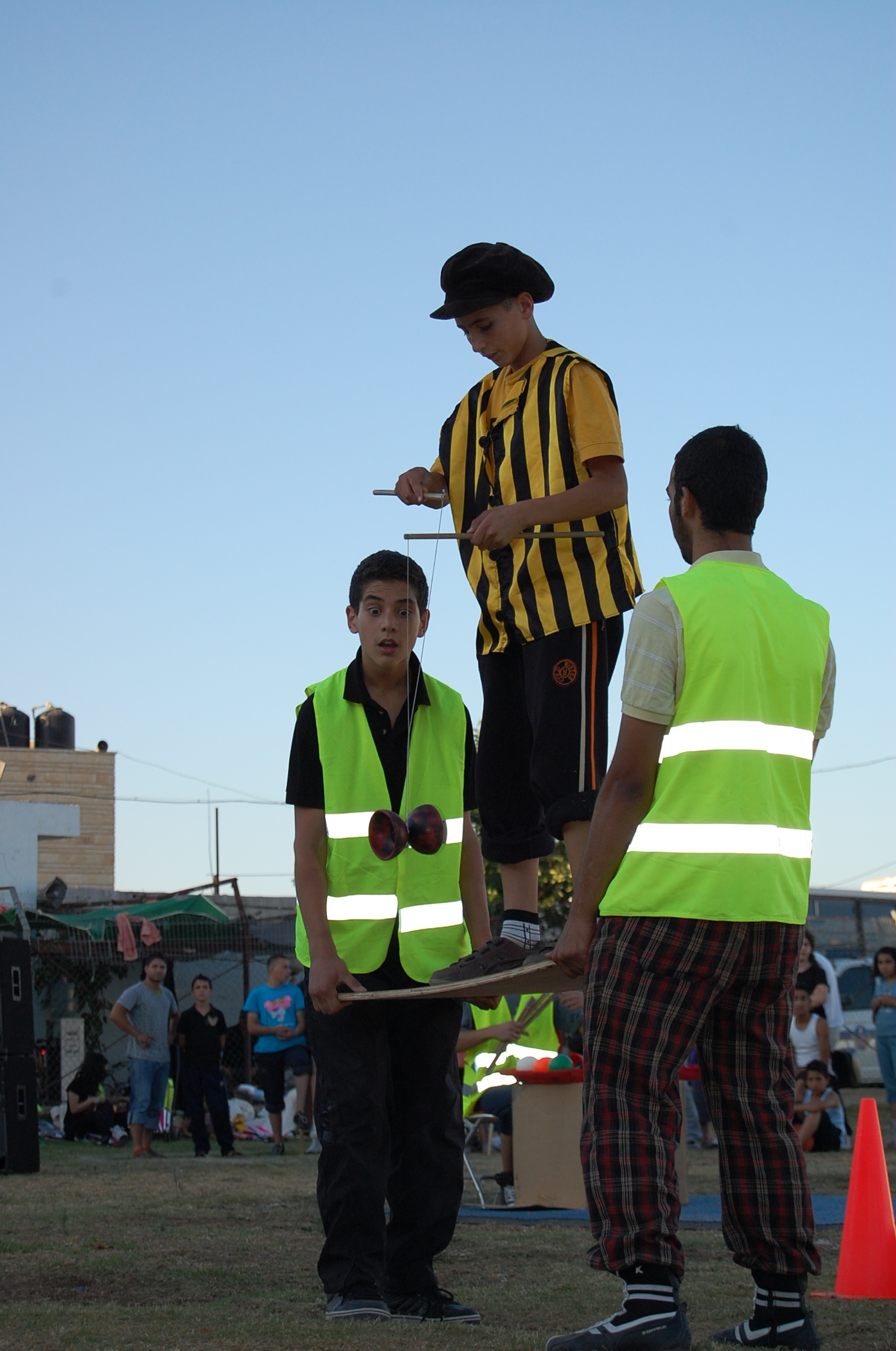 A colour photograph of the Palestine Circus School's production, "The Mobile Circus" in the Israeli-occupied city of Jenin in 2010. With a suite of training courses for all sections of society, the show featured a cast including, Ahmad Taleb, Alaʾ abu ar-Rub, Fady Zumurud, Hazar Azza, Laur Ṣadeq, Marah Ashmar, Mayrouby Makhluq, Muhammad abu ar-Rub, Muhammad abu Kishek, Muhammad abu Taleb, Muhammad al-Azza, Muhammad Ghayth, Muʿtaṣem Ghayth, and Yazan ʿWaydat.