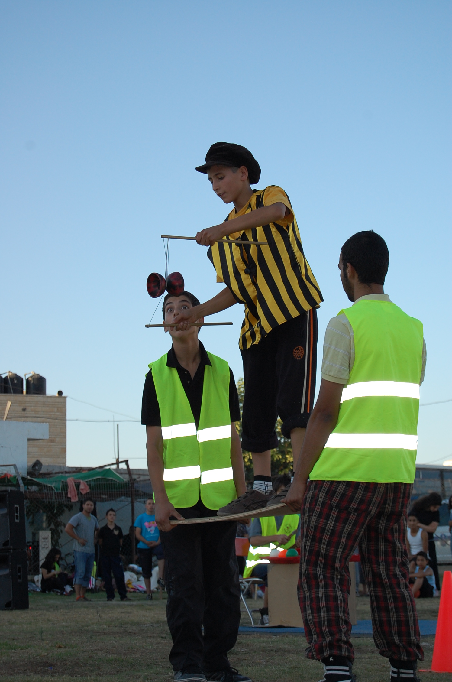 A colour photograph of the Palestine Circus School's production, "The Mobile Circus" in the Israeli-occupied city of Jenin in 2010. With a suite of training courses for all sections of society, the show featured a cast including, Ahmad Taleb, Alaʾ abu ar-Rub, Fady Zumurud, Hazar Azza, Laur Ṣadeq, Marah Ashmar, Mayrouby Makhluq, Muhammad abu ar-Rub, Muhammad abu Kishek, Muhammad abu Taleb, Muhammad al-Azza, Muhammad Ghayth, Muʿtaṣem Ghayth, and Yazan ʿWaydat.