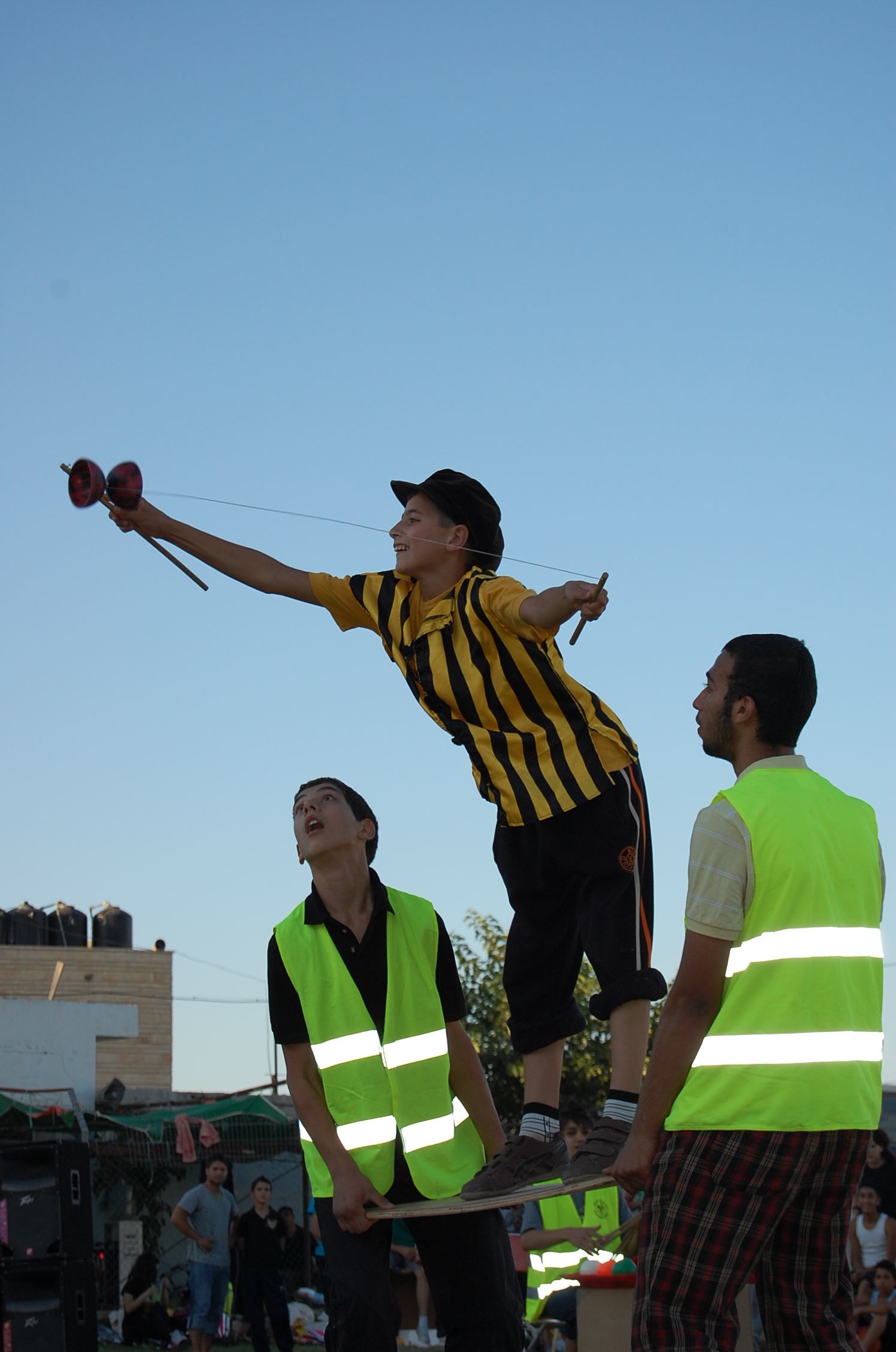 A colour photograph of the Palestine Circus School's production, "The Mobile Circus" in the Israeli-occupied city of Jenin in 2010. With a suite of training courses for all sections of society, the show featured a cast including, Ahmad Taleb, Alaʾ abu ar-Rub, Fady Zumurud, Hazar Azza, Laur Ṣadeq, Marah Ashmar, Mayrouby Makhluq, Muhammad abu ar-Rub, Muhammad abu Kishek, Muhammad abu Taleb, Muhammad al-Azza, Muhammad Ghayth, Muʿtaṣem Ghayth, and Yazan ʿWaydat.