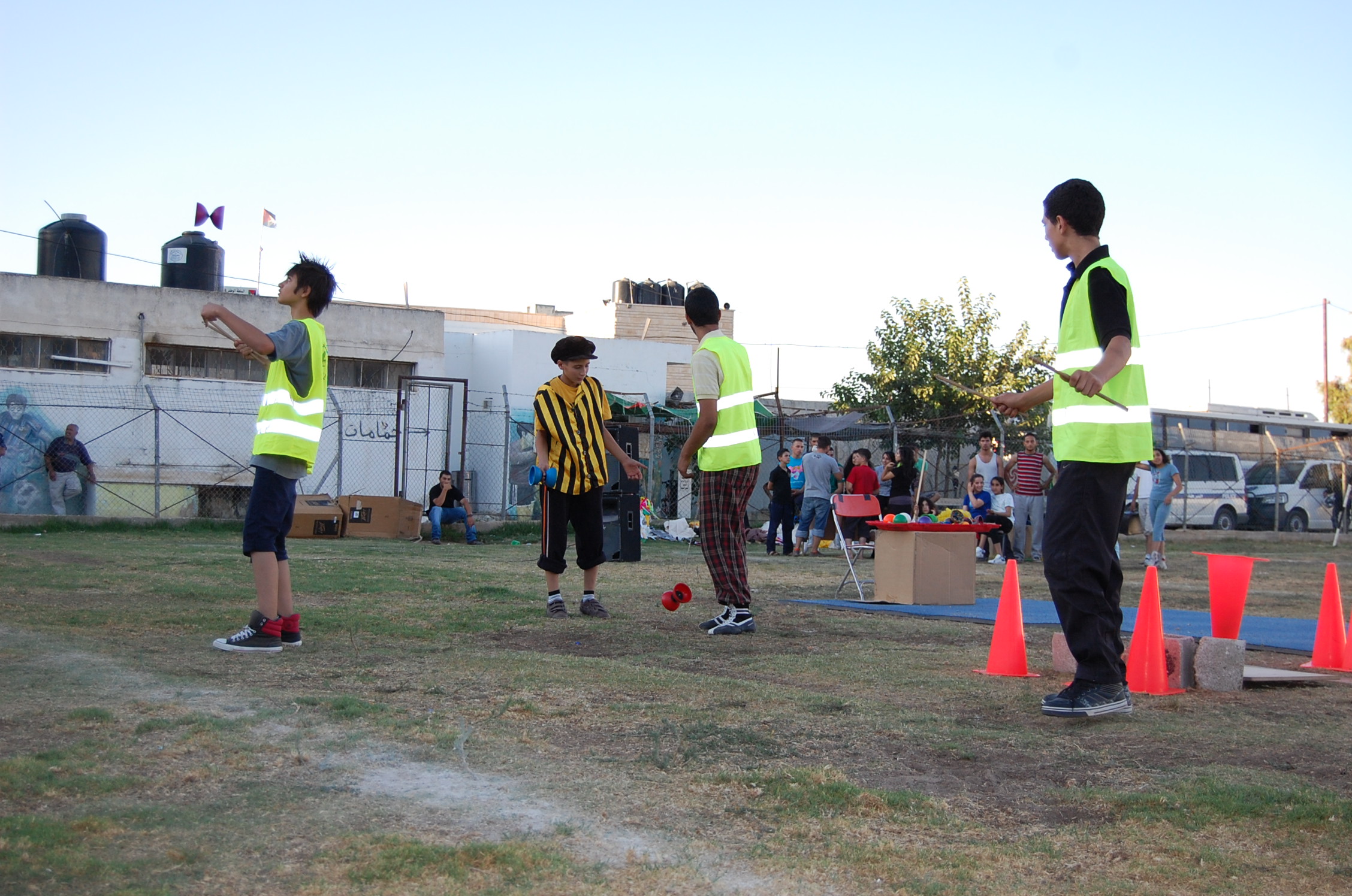 A colour photograph of the Palestine Circus School's production, "The Mobile Circus" in the Israeli-occupied city of Jenin in 2010. With a suite of training courses for all sections of society, the show featured a cast including, Ahmad Taleb, Alaʾ abu ar-Rub, Fady Zumurud, Hazar Azza, Laur Ṣadeq, Marah Ashmar, Mayrouby Makhluq, Muhammad abu ar-Rub, Muhammad abu Kishek, Muhammad abu Taleb, Muhammad al-Azza, Muhammad Ghayth, Muʿtaṣem Ghayth, and Yazan ʿWaydat.