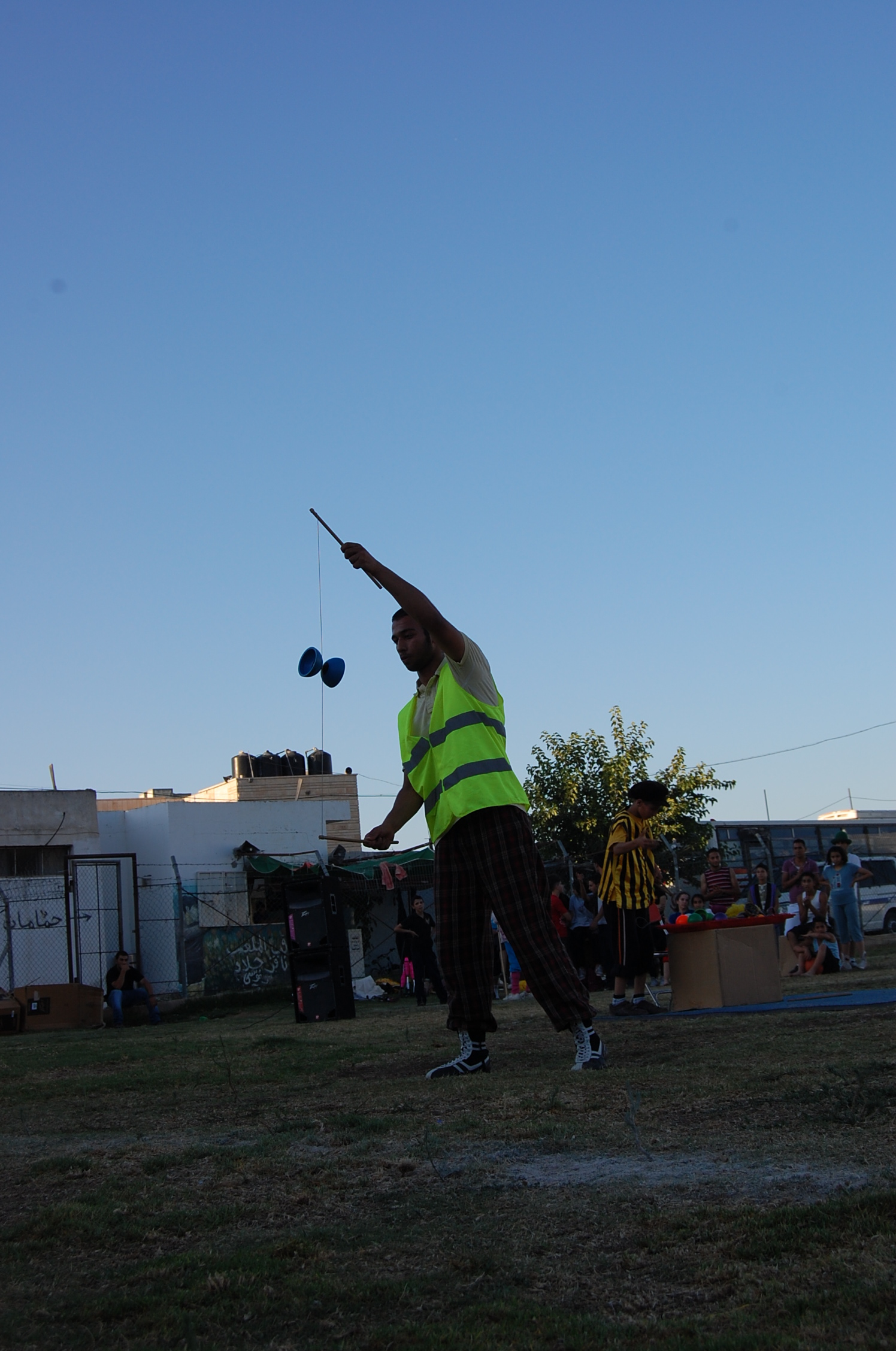 A colour photograph of the Palestine Circus School's production, "The Mobile Circus" in the Israeli-occupied city of Jenin in 2010. With a suite of training courses for all sections of society, the show featured a cast including, Ahmad Taleb, Alaʾ abu ar-Rub, Fady Zumurud, Hazar Azza, Laur Ṣadeq, Marah Ashmar, Mayrouby Makhluq, Muhammad abu ar-Rub, Muhammad abu Kishek, Muhammad abu Taleb, Muhammad al-Azza, Muhammad Ghayth, Muʿtaṣem Ghayth, and Yazan ʿWaydat.