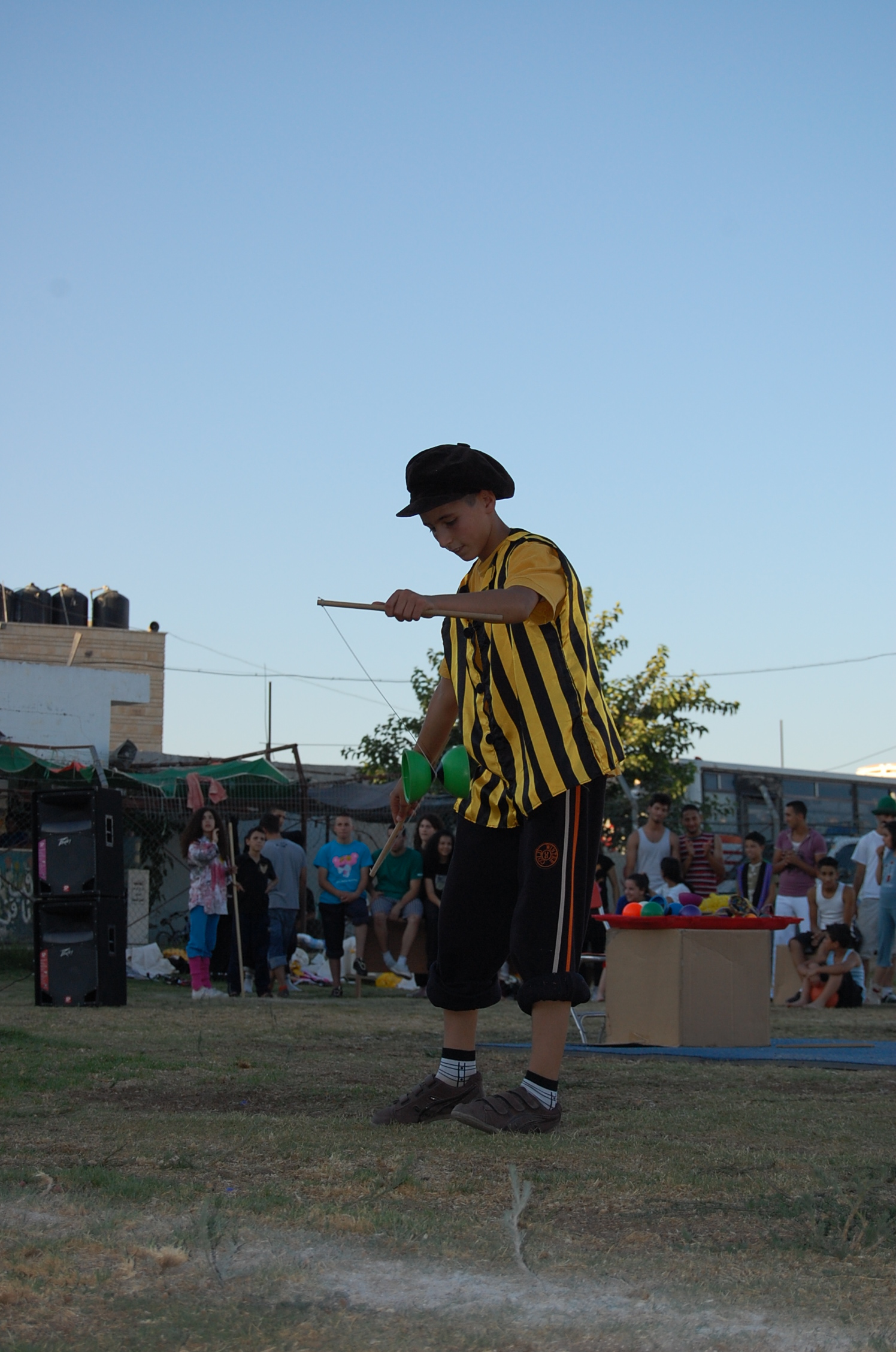A colour photograph of the Palestine Circus School's production, "The Mobile Circus" in the Israeli-occupied city of Jenin in 2010. With a suite of training courses for all sections of society, the show featured a cast including, Ahmad Taleb, Alaʾ abu ar-Rub, Fady Zumurud, Hazar Azza, Laur Ṣadeq, Marah Ashmar, Mayrouby Makhluq, Muhammad abu ar-Rub, Muhammad abu Kishek, Muhammad abu Taleb, Muhammad al-Azza, Muhammad Ghayth, Muʿtaṣem Ghayth, and Yazan ʿWaydat.