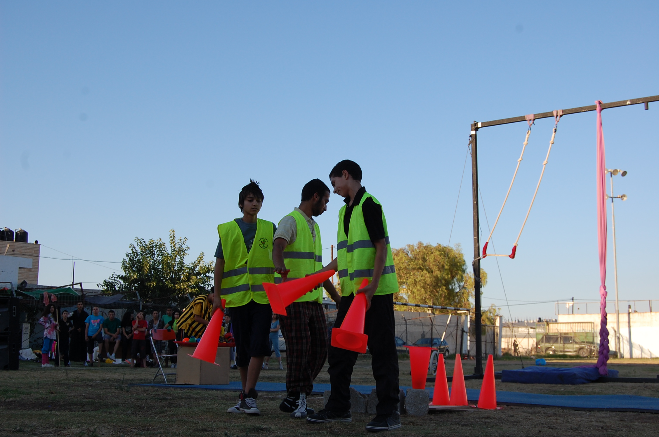 A colour photograph of the Palestine Circus School's production, "The Mobile Circus" in the Israeli-occupied city of Jenin in 2010. With a suite of training courses for all sections of society, the show featured a cast including, Ahmad Taleb, Alaʾ abu ar-Rub, Fady Zumurud, Hazar Azza, Laur Ṣadeq, Marah Ashmar, Mayrouby Makhluq, Muhammad abu ar-Rub, Muhammad abu Kishek, Muhammad abu Taleb, Muhammad al-Azza, Muhammad Ghayth, Muʿtaṣem Ghayth, and Yazan ʿWaydat.