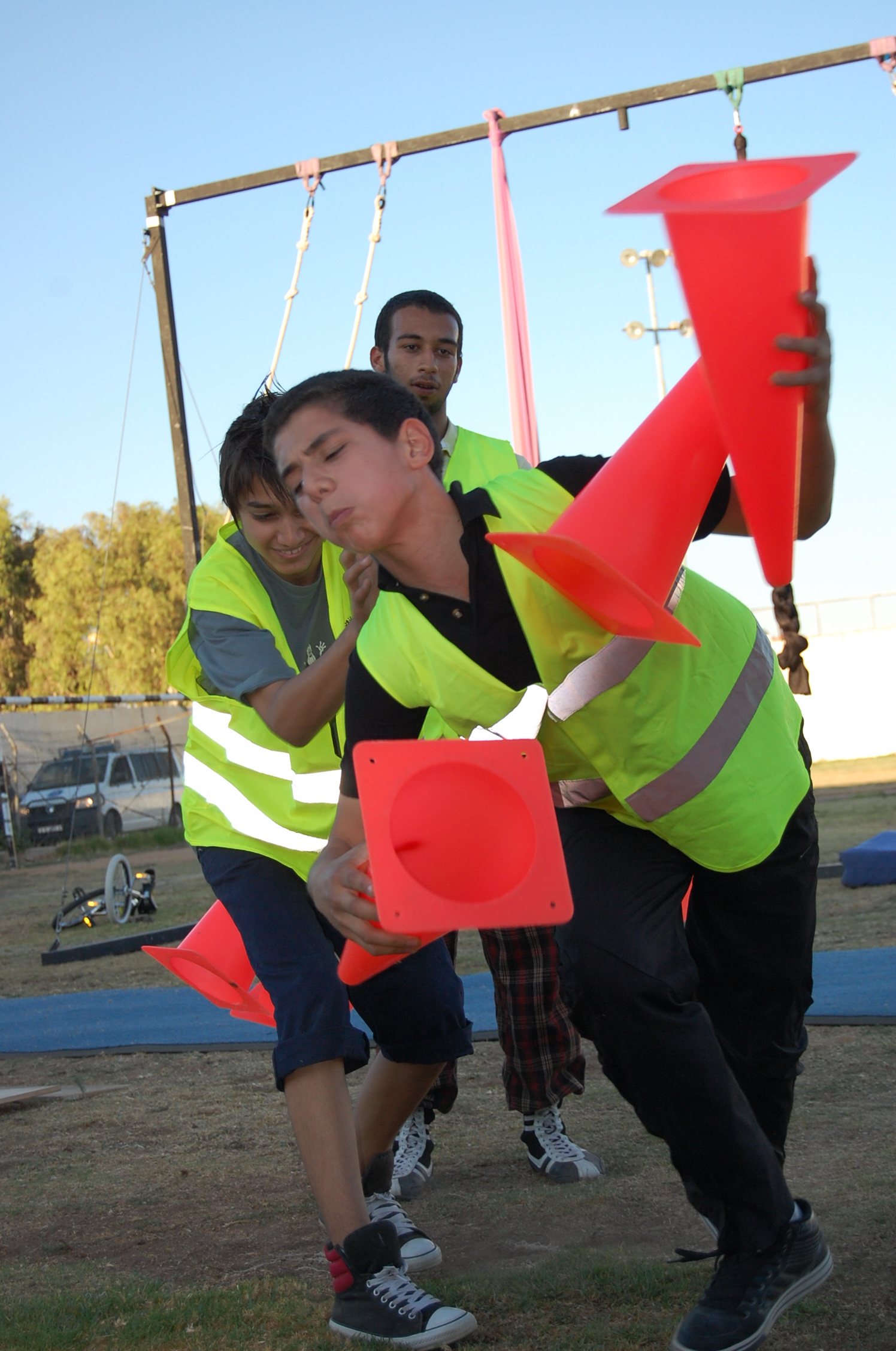A colour photograph of the Palestine Circus School's production, "The Mobile Circus" in the Israeli-occupied city of Jenin in 2010. With a suite of training courses for all sections of society, the show featured a cast including, Ahmad Taleb, Alaʾ abu ar-Rub, Fady Zumurud, Hazar Azza, Laur Ṣadeq, Marah Ashmar, Mayrouby Makhluq, Muhammad abu ar-Rub, Muhammad abu Kishek, Muhammad abu Taleb, Muhammad al-Azza, Muhammad Ghayth, Muʿtaṣem Ghayth, and Yazan ʿWaydat.