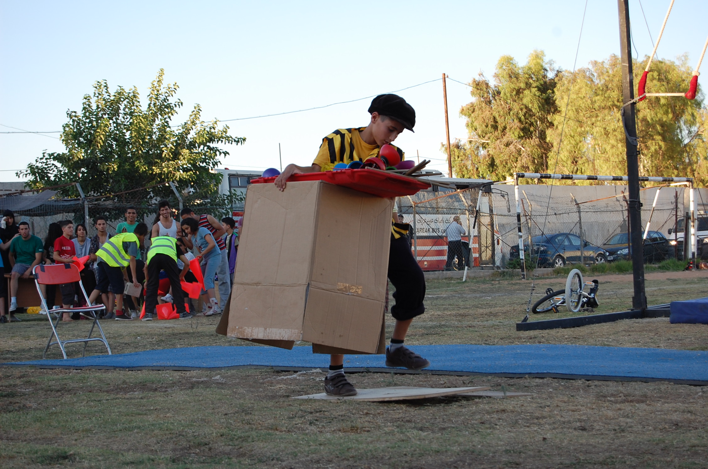 A colour photograph of the Palestine Circus School's production, "The Mobile Circus" in the Israeli-occupied city of Jenin in 2010. With a suite of training courses for all sections of society, the show featured a cast including, Ahmad Taleb, Alaʾ abu ar-Rub, Fady Zumurud, Hazar Azza, Laur Ṣadeq, Marah Ashmar, Mayrouby Makhluq, Muhammad abu ar-Rub, Muhammad abu Kishek, Muhammad abu Taleb, Muhammad al-Azza, Muhammad Ghayth, Muʿtaṣem Ghayth, and Yazan ʿWaydat.