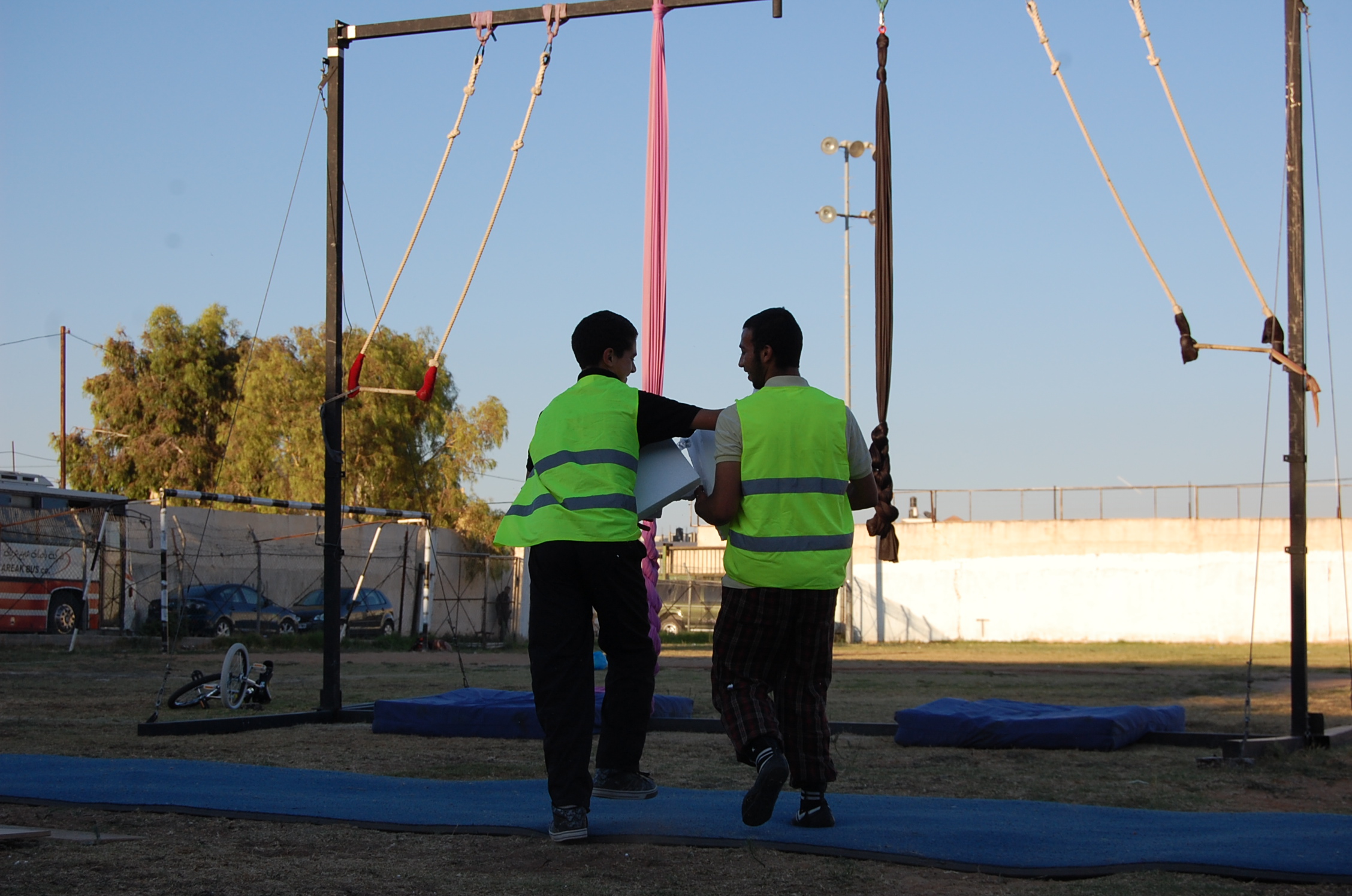 A colour photograph of the Palestine Circus School's production, "The Mobile Circus" in the Israeli-occupied city of Jenin in 2010. With a suite of training courses for all sections of society, the show featured a cast including, Ahmad Taleb, Alaʾ abu ar-Rub, Fady Zumurud, Hazar Azza, Laur Ṣadeq, Marah Ashmar, Mayrouby Makhluq, Muhammad abu ar-Rub, Muhammad abu Kishek, Muhammad abu Taleb, Muhammad al-Azza, Muhammad Ghayth, Muʿtaṣem Ghayth, and Yazan ʿWaydat.