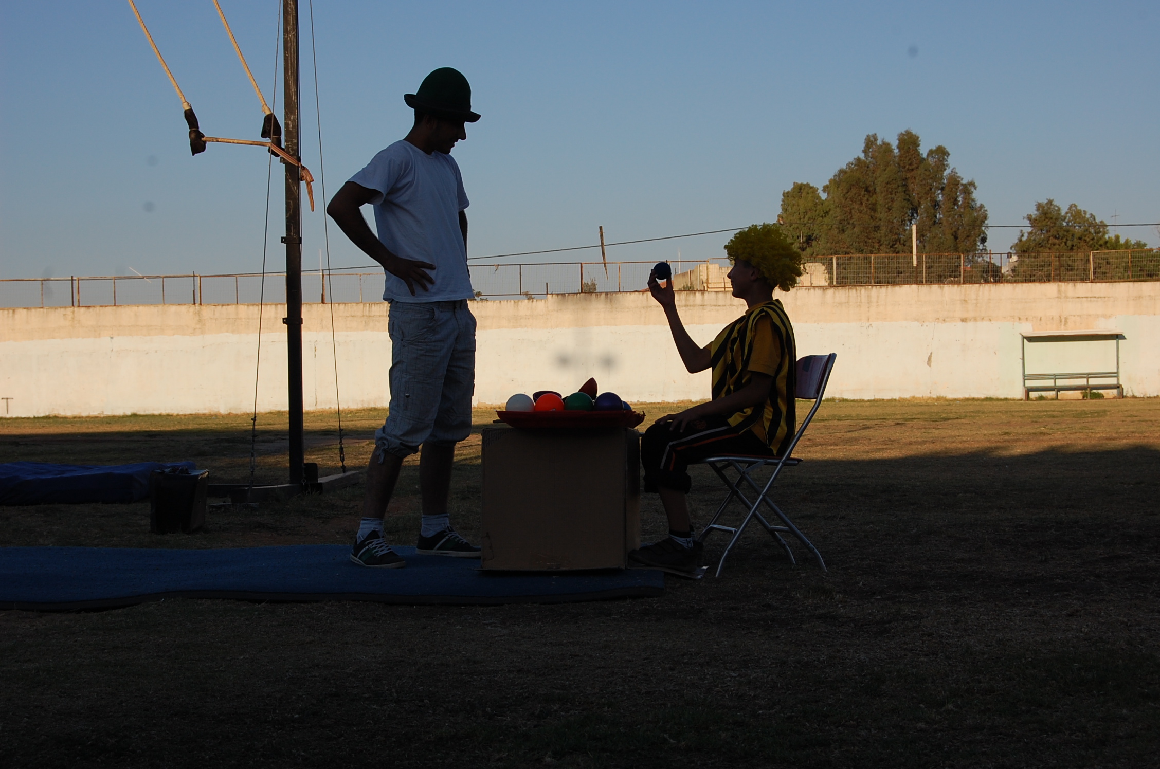A colour photograph of the Palestine Circus School's production, "The Mobile Circus" in the Israeli-occupied city of Jenin in 2010. With a suite of training courses for all sections of society, the show featured a cast including, Ahmad Taleb, Alaʾ abu ar-Rub, Fady Zumurud, Hazar Azza, Laur Ṣadeq, Marah Ashmar, Mayrouby Makhluq, Muhammad abu ar-Rub, Muhammad abu Kishek, Muhammad abu Taleb, Muhammad al-Azza, Muhammad Ghayth, Muʿtaṣem Ghayth, and Yazan ʿWaydat.