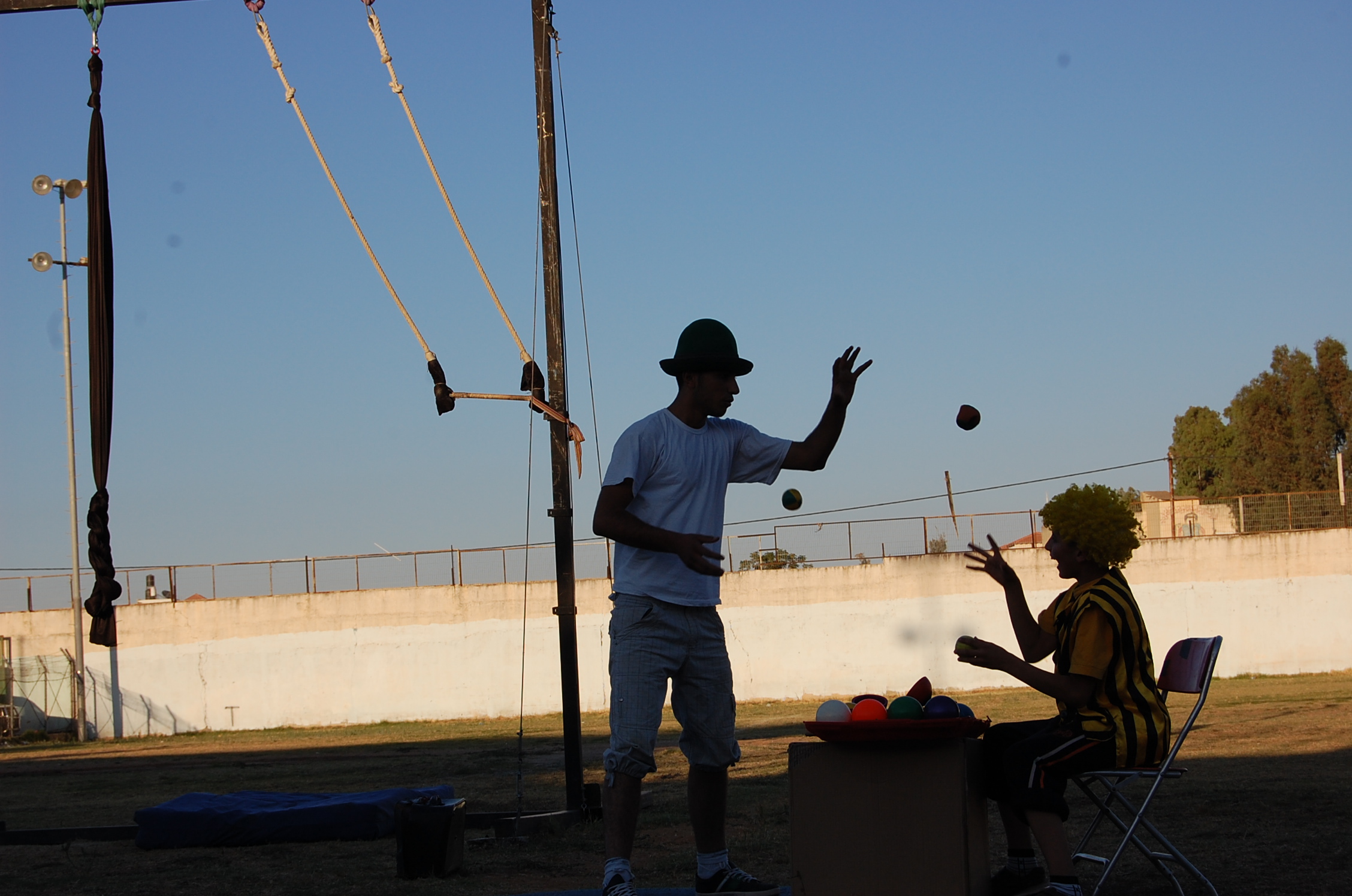 A colour photograph of the Palestine Circus School's production, "The Mobile Circus" in the Israeli-occupied city of Jenin in 2010. With a suite of training courses for all sections of society, the show featured a cast including, Ahmad Taleb, Alaʾ abu ar-Rub, Fady Zumurud, Hazar Azza, Laur Ṣadeq, Marah Ashmar, Mayrouby Makhluq, Muhammad abu ar-Rub, Muhammad abu Kishek, Muhammad abu Taleb, Muhammad al-Azza, Muhammad Ghayth, Muʿtaṣem Ghayth, and Yazan ʿWaydat.