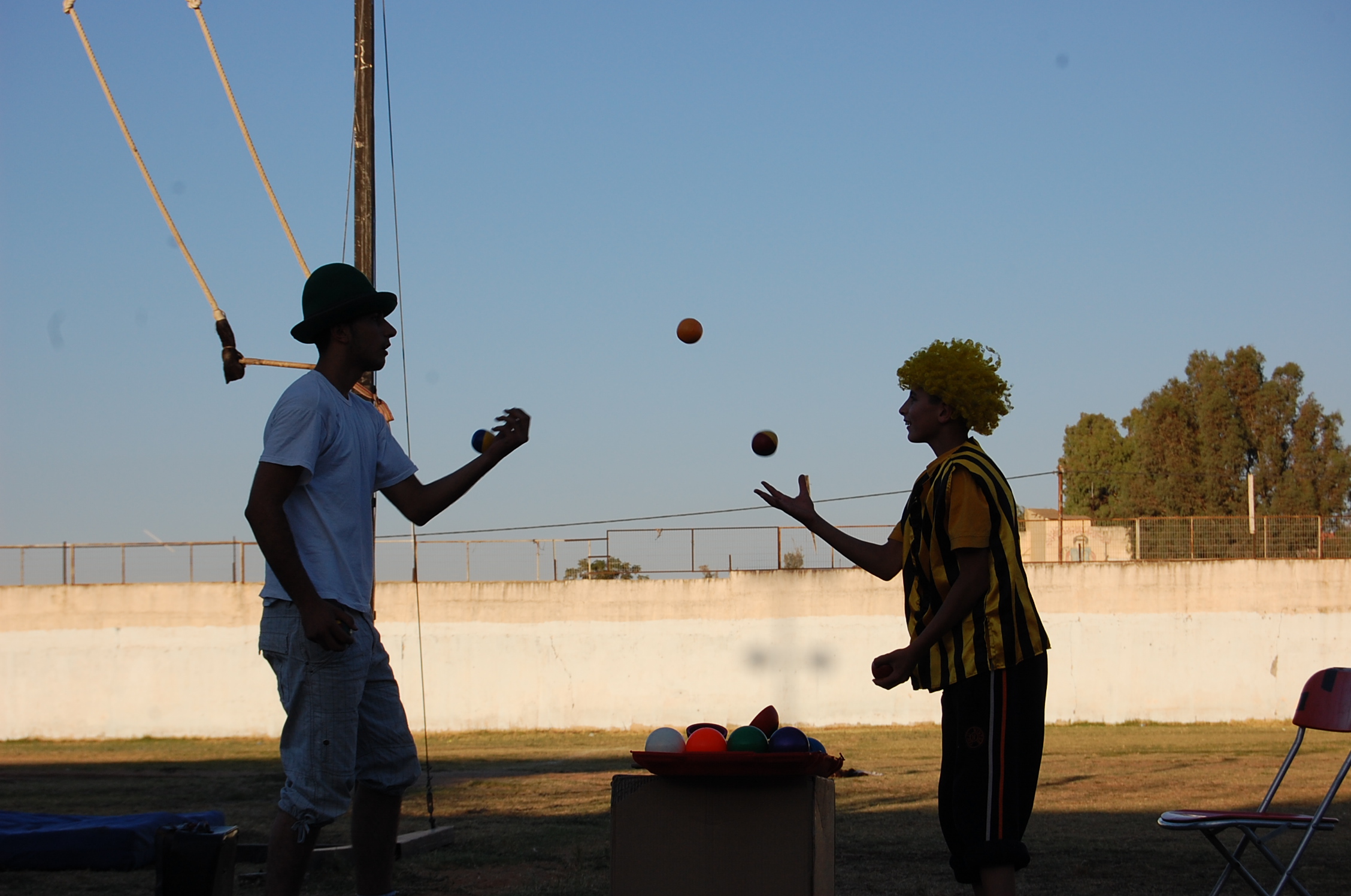 A colour photograph of the Palestine Circus School's production, "The Mobile Circus" in the Israeli-occupied city of Jenin in 2010. With a suite of training courses for all sections of society, the show featured a cast including, Ahmad Taleb, Alaʾ abu ar-Rub, Fady Zumurud, Hazar Azza, Laur Ṣadeq, Marah Ashmar, Mayrouby Makhluq, Muhammad abu ar-Rub, Muhammad abu Kishek, Muhammad abu Taleb, Muhammad al-Azza, Muhammad Ghayth, Muʿtaṣem Ghayth, and Yazan ʿWaydat.