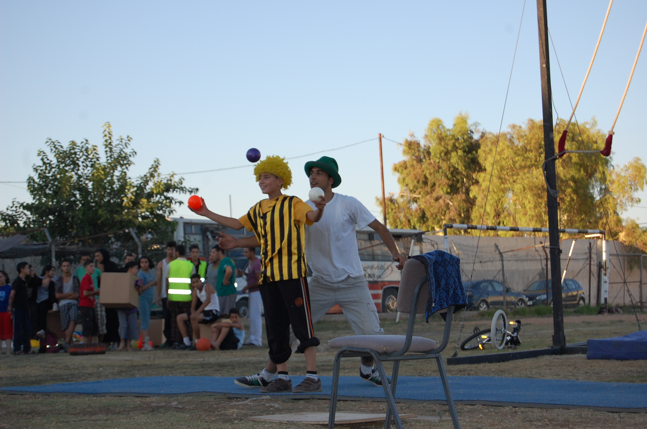 A colour photograph of the Palestine Circus School's production, "The Mobile Circus" in the Israeli-occupied city of Jenin in 2010. With a suite of training courses for all sections of society, the show featured a cast including, Ahmad Taleb, Alaʾ abu ar-Rub, Fady Zumurud, Hazar Azza, Laur Ṣadeq, Marah Ashmar, Mayrouby Makhluq, Muhammad abu ar-Rub, Muhammad abu Kishek, Muhammad abu Taleb, Muhammad al-Azza, Muhammad Ghayth, Muʿtaṣem Ghayth, and Yazan ʿWaydat.