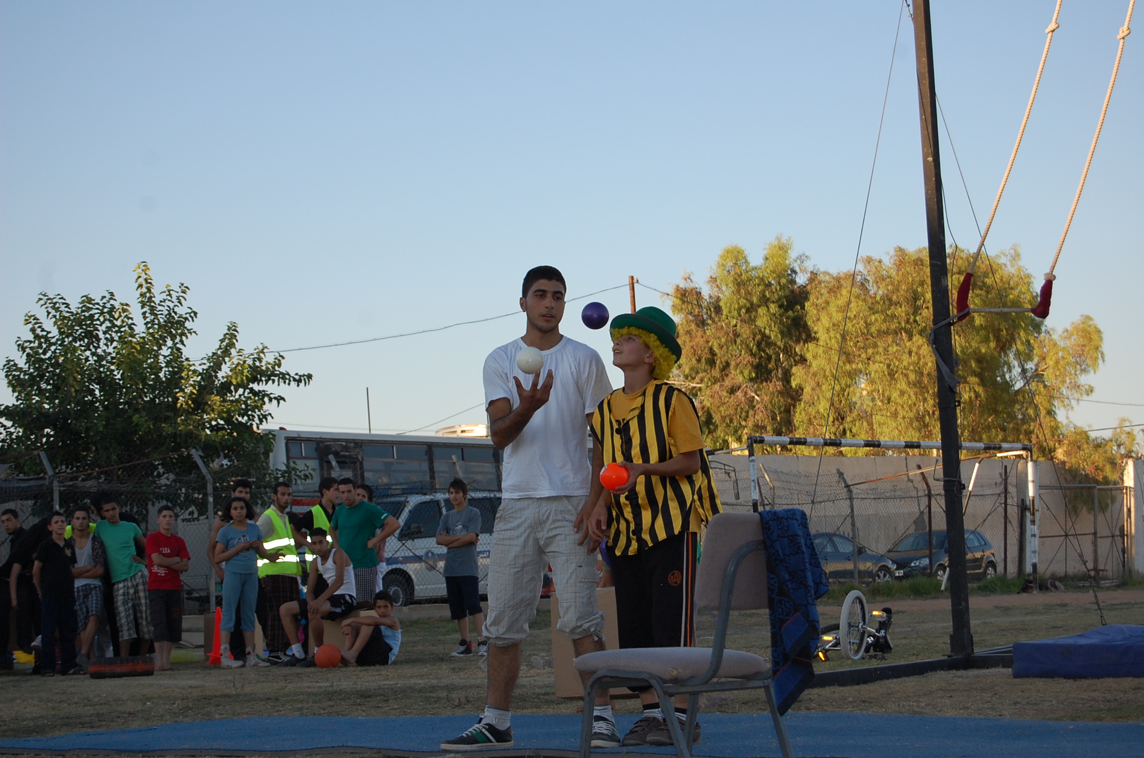 A colour photograph of the Palestine Circus School's production, "The Mobile Circus" in the Israeli-occupied city of Jenin in 2010. With a suite of training courses for all sections of society, the show featured a cast including, Ahmad Taleb, Alaʾ abu ar-Rub, Fady Zumurud, Hazar Azza, Laur Ṣadeq, Marah Ashmar, Mayrouby Makhluq, Muhammad abu ar-Rub, Muhammad abu Kishek, Muhammad abu Taleb, Muhammad al-Azza, Muhammad Ghayth, Muʿtaṣem Ghayth, and Yazan ʿWaydat.