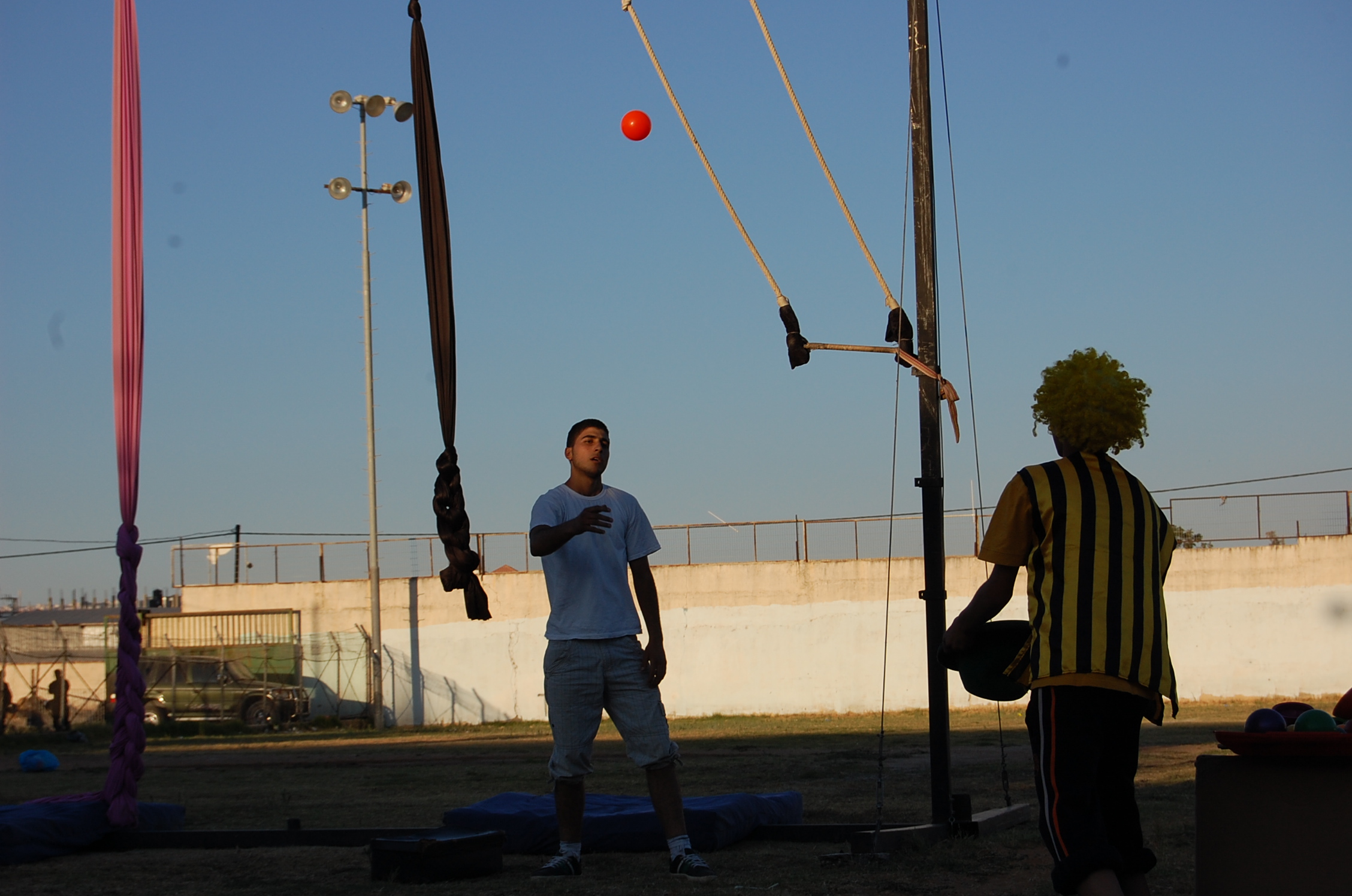 A colour photograph of the Palestine Circus School's production, "The Mobile Circus" in the Israeli-occupied city of Jenin in 2010. With a suite of training courses for all sections of society, the show featured a cast including, Ahmad Taleb, Alaʾ abu ar-Rub, Fady Zumurud, Hazar Azza, Laur Ṣadeq, Marah Ashmar, Mayrouby Makhluq, Muhammad abu ar-Rub, Muhammad abu Kishek, Muhammad abu Taleb, Muhammad al-Azza, Muhammad Ghayth, Muʿtaṣem Ghayth, and Yazan ʿWaydat.