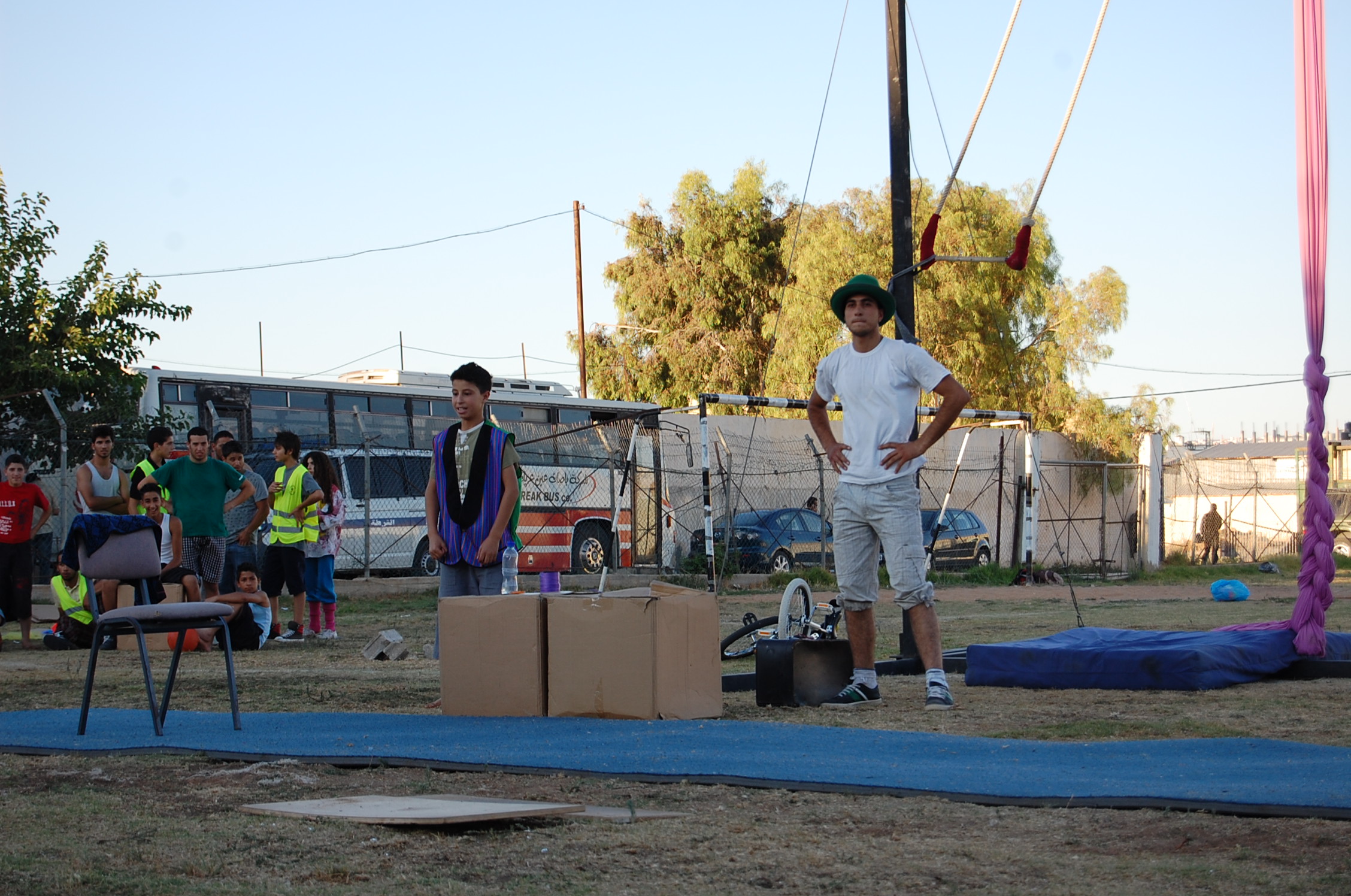 A colour photograph of the Palestine Circus School's production, "The Mobile Circus" in the Israeli-occupied city of Jenin in 2010. With a suite of training courses for all sections of society, the show featured a cast including, Ahmad Taleb, Alaʾ abu ar-Rub, Fady Zumurud, Hazar Azza, Laur Ṣadeq, Marah Ashmar, Mayrouby Makhluq, Muhammad abu ar-Rub, Muhammad abu Kishek, Muhammad abu Taleb, Muhammad al-Azza, Muhammad Ghayth, Muʿtaṣem Ghayth, and Yazan ʿWaydat.