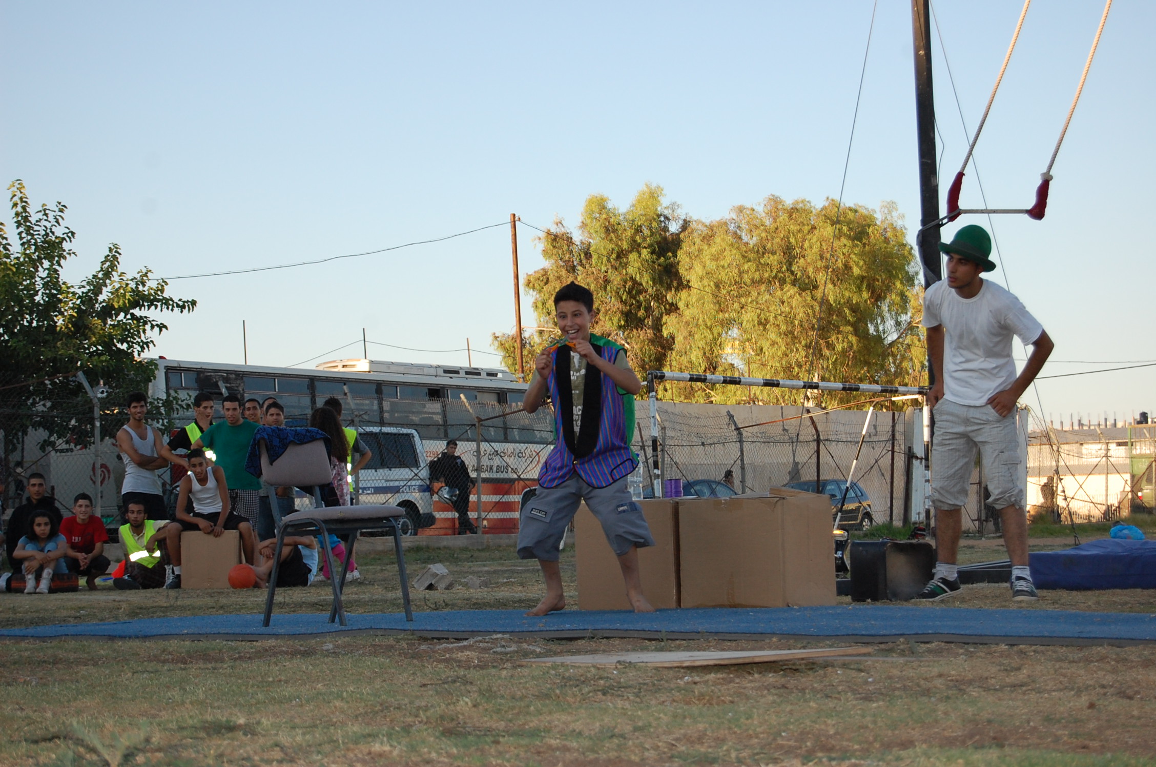 A colour photograph of the Palestine Circus School's production, "The Mobile Circus" in the Israeli-occupied city of Jenin in 2010. With a suite of training courses for all sections of society, the show featured a cast including, Ahmad Taleb, Alaʾ abu ar-Rub, Fady Zumurud, Hazar Azza, Laur Ṣadeq, Marah Ashmar, Mayrouby Makhluq, Muhammad abu ar-Rub, Muhammad abu Kishek, Muhammad abu Taleb, Muhammad al-Azza, Muhammad Ghayth, Muʿtaṣem Ghayth, and Yazan ʿWaydat.