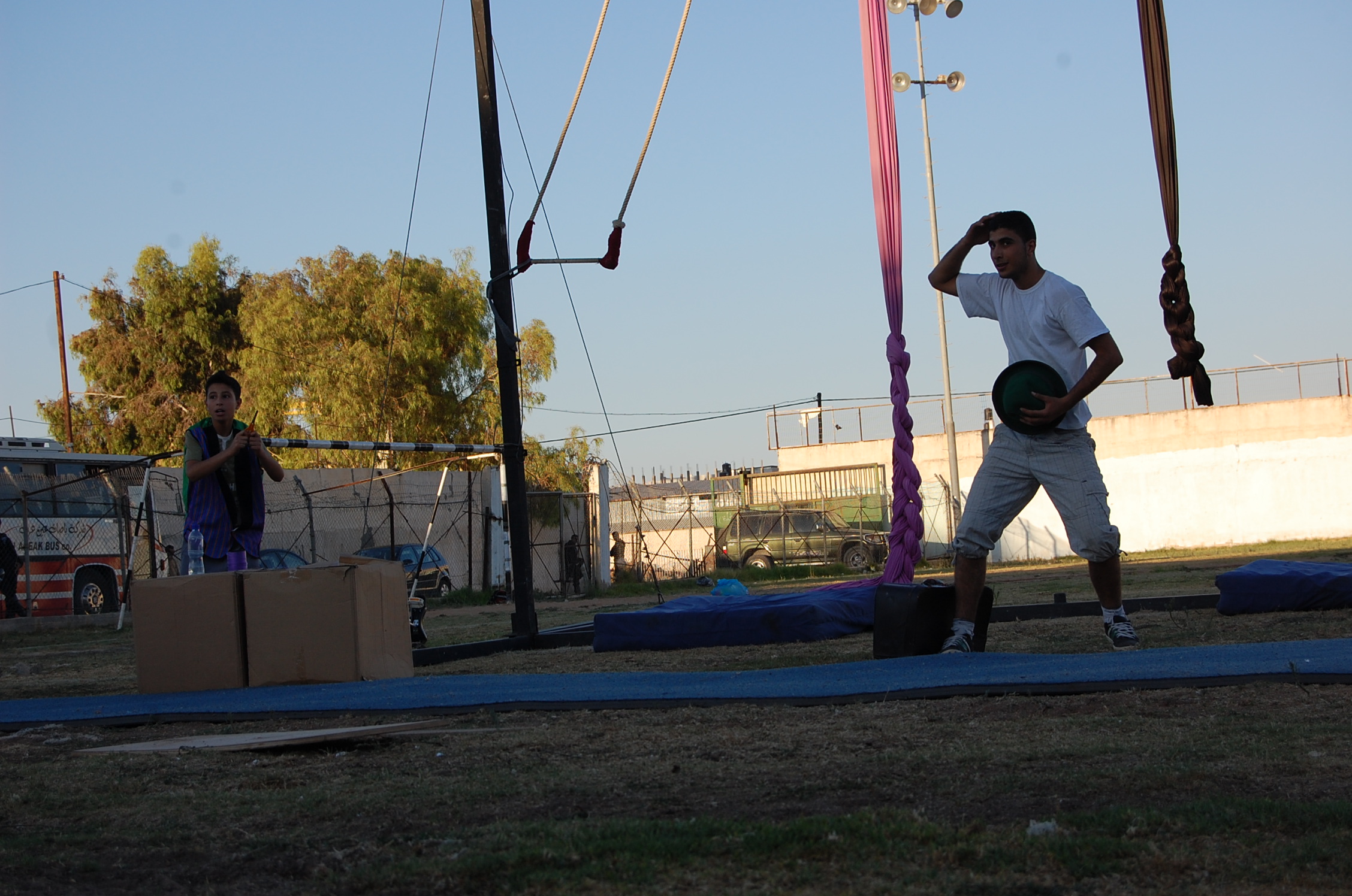 A colour photograph of the Palestine Circus School's production, "The Mobile Circus" in the Israeli-occupied city of Jenin in 2010. With a suite of training courses for all sections of society, the show featured a cast including, Ahmad Taleb, Alaʾ abu ar-Rub, Fady Zumurud, Hazar Azza, Laur Ṣadeq, Marah Ashmar, Mayrouby Makhluq, Muhammad abu ar-Rub, Muhammad abu Kishek, Muhammad abu Taleb, Muhammad al-Azza, Muhammad Ghayth, Muʿtaṣem Ghayth, and Yazan ʿWaydat.