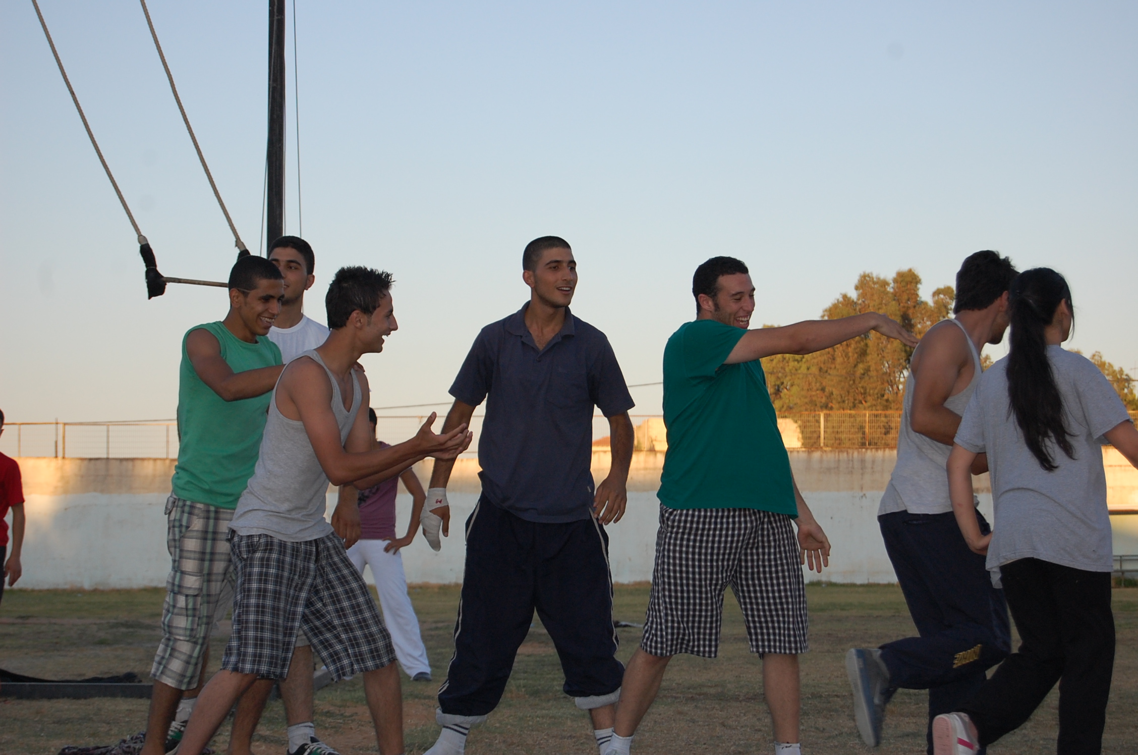 A colour photograph of the Palestine Circus School's production, "The Mobile Circus" in the Israeli-occupied city of Jenin in 2010. With a suite of training courses for all sections of society, the show featured a cast including, Ahmad Taleb, Alaʾ abu ar-Rub, Fady Zumurud, Hazar Azza, Laur Ṣadeq, Marah Ashmar, Mayrouby Makhluq, Muhammad abu ar-Rub, Muhammad abu Kishek, Muhammad abu Taleb, Muhammad al-Azza, Muhammad Ghayth, Muʿtaṣem Ghayth, and Yazan ʿWaydat.