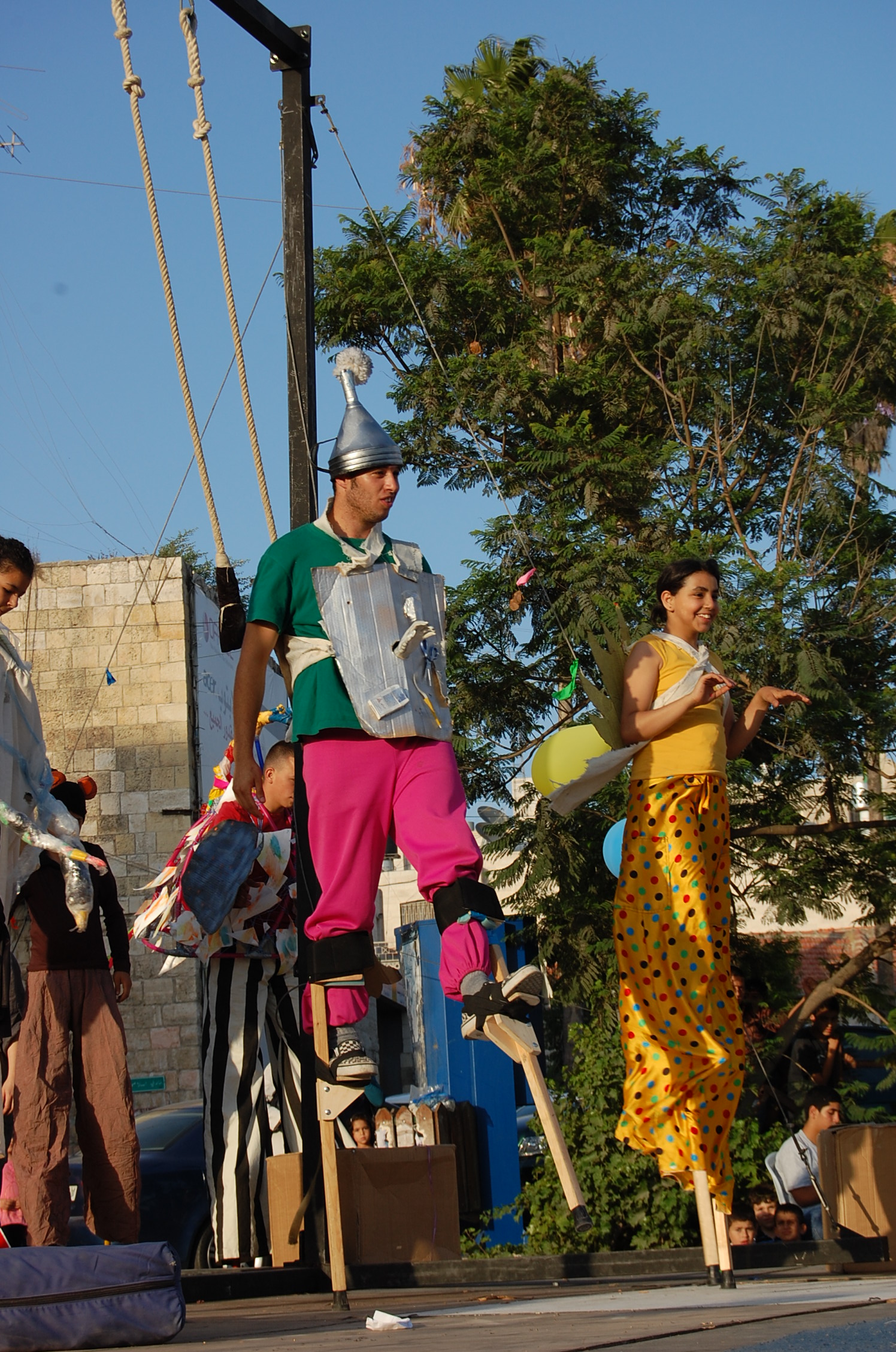 A colour photograph of the Palestine Circus School's production, "The Mobile Circus" at the Ramallah Municipality Souk al-Harajeh event in 2010. With a suite of training courses for all sections of society, the show featured a cast including, Ahmad Taleb, Alaʾ abu ar-Rub, Fady Zumurud, Hazar Azza, Laur Ṣadeq, Marah Ashmar, Mayrouby Makhluq, Muhammad abu ar-Rub, Muhammad abu Kishek, Muhammad abu Taleb, Muhammad al-Azza, Muhammad Ghayth, Muʿtaṣem Ghayth, Sawsan Baṣalat, Sirin Tuqan, and Yazan ʿWaydat.
