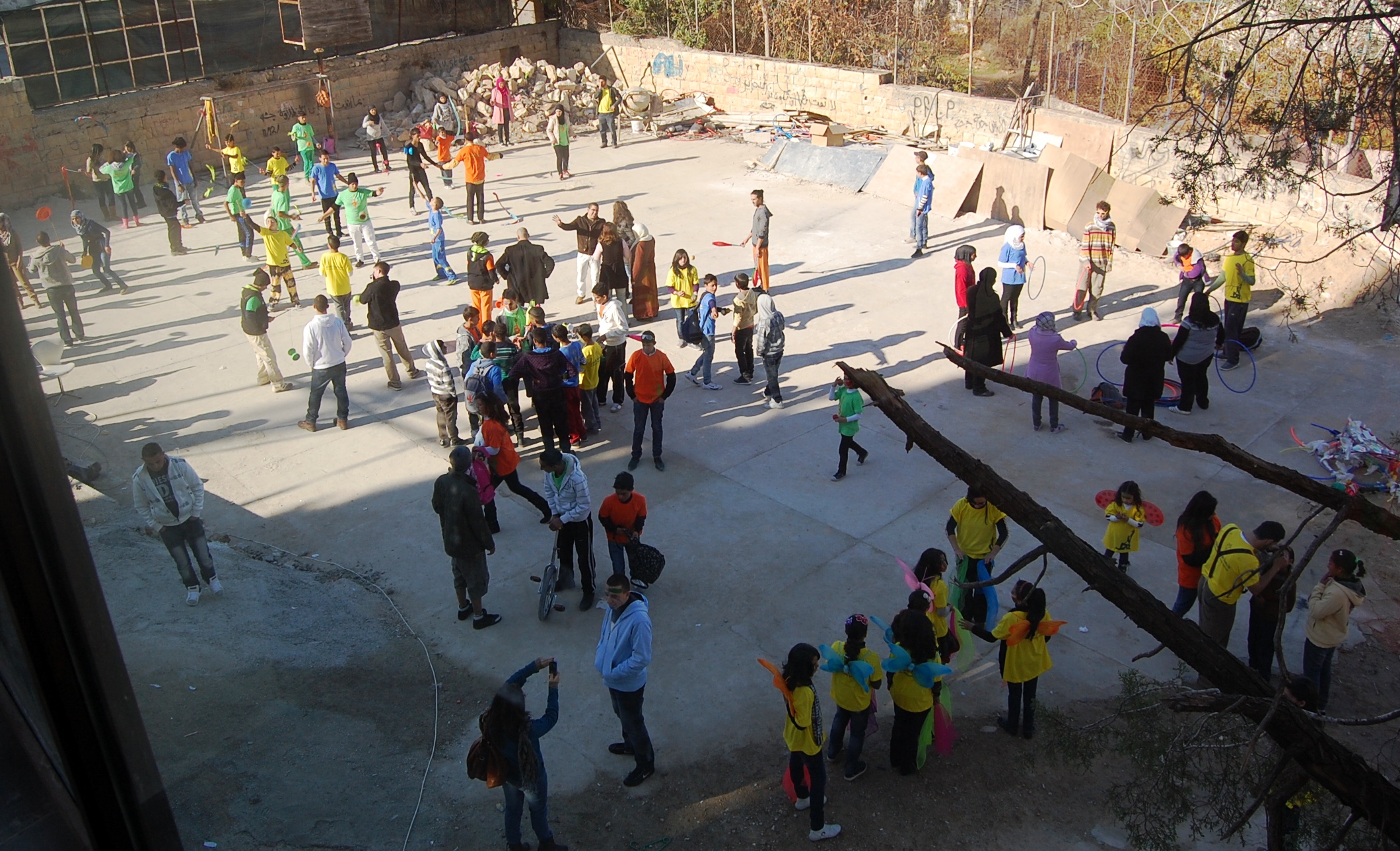 صورة ملونة ليوم مفتوح مع مسيرة فنية في بيرزيت، وهو بمثابة يوم لكل طلبة السيرك في فلسطين من بيرزيت، رام الله، الفارعة، الجلزون، جنين، القدس، الخليل. وتكون المسيرة بمثابة عرض فني لكل ما تم تعلمه.