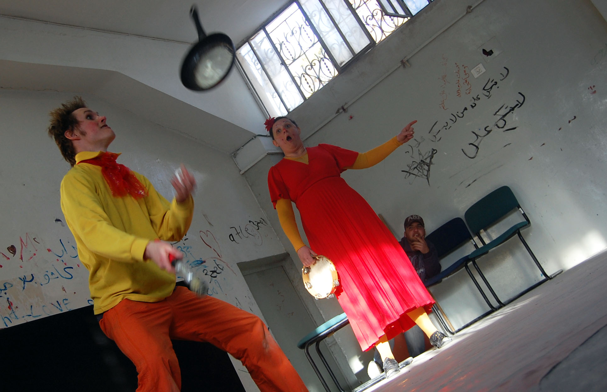 A colour photograph of a performance by a Belgian circus troupe hosted by the Palestinian Circus School.