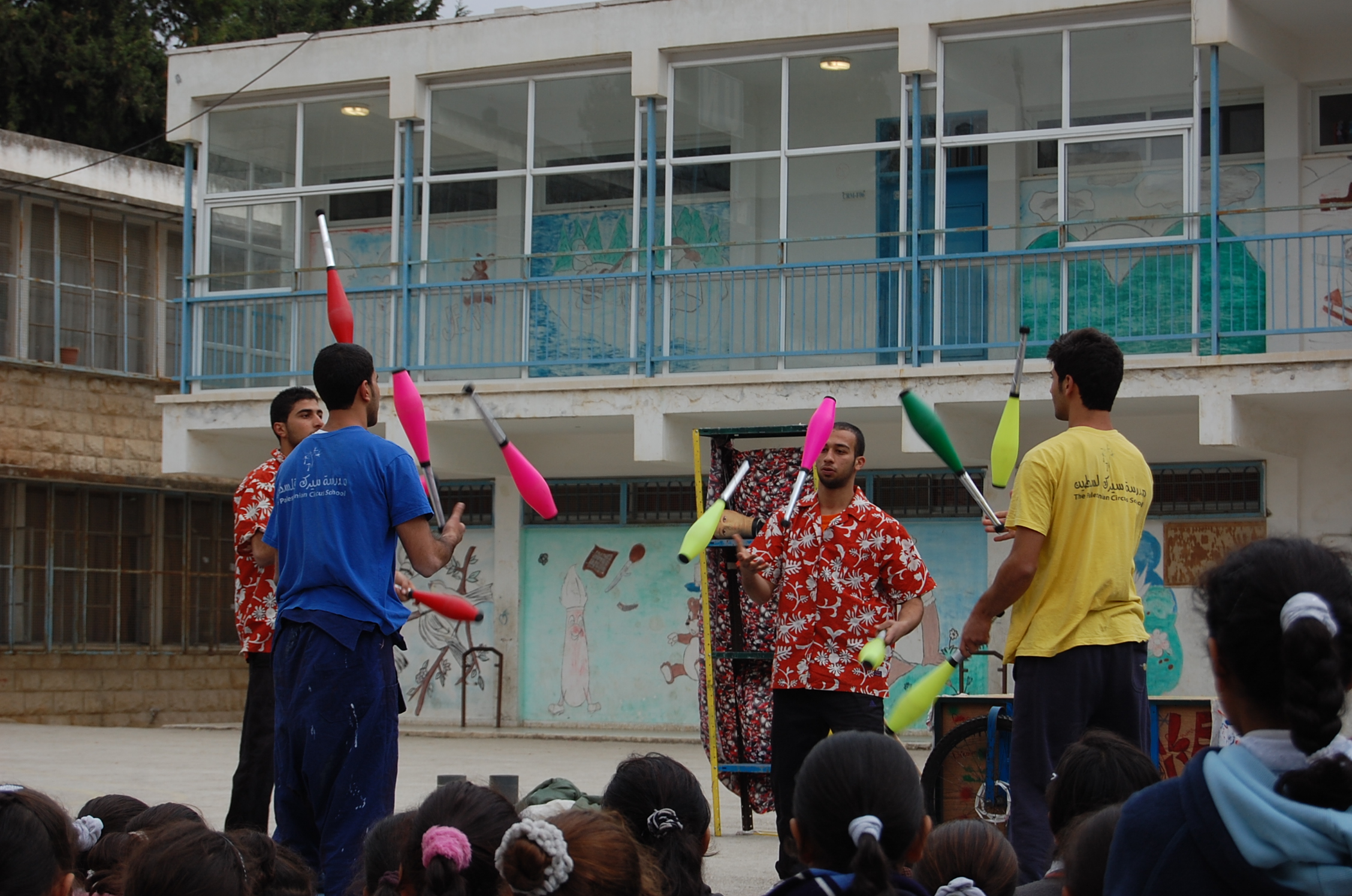 صورة ملونة ترصد لمحة من عرض "أحلام للبيع"، وهو الإنتاج الثالث لمدرسة سيرك فلسطين عام 2010 في مدرسة بنات الأمعري. الممثلون : أحمد أبو طالب، محمد أبو طالب، محمد أبو سخا، ونور أبو الرب. تدريب وإخراج كل من: جاك جاكس، سيفيرين بيليني، كريستا فاتكا، نايف عثمان وتوماس سوكووُوفيتش. ديكور وأزياء: رامي عارضة.