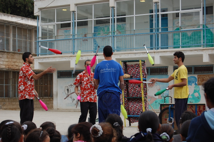 صورة ملونة ترصد لمحة من عرض "أحلام للبيع"، وهو الإنتاج الثالث لمدرسة سيرك فلسطين عام 2010 في مدرسة بنات الأمعري. الممثلون : أحمد أبو طالب، محمد أبو طالب، محمد أبو سخا، ونور أبو الرب. تدريب وإخراج كل من: جاك جاكس، سيفيرين بيليني، كريستا فاتكا، نايف عثمان وتوماس سوكووُوفيتش. ديكور وأزياء: رامي عارضة.