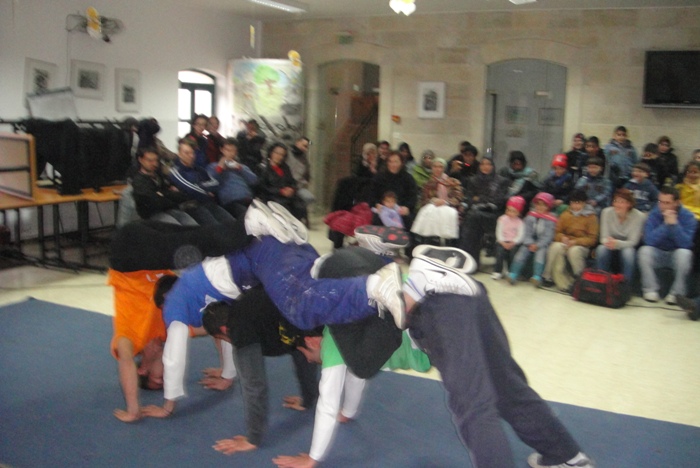 صورة ملونة ترصد لمحة من عرض "أحلام للبيع"، وهو الإنتاج الثالث لمدرسة سيرك فلسطين عام 2010 في مركز غراس الثقافي في بيت لحم. الممثلون : أحمد أبو طالب، محمد أبو طالب، محمد أبو سخا، ونور أبو الرب. تدريب وإخراج كل من: جاك جاكس، سيفيرين بيليني، كريستا فاتكا، نايف عثمان وتوماس سوكووُوفيتش. ديكور وأزياء: رامي عارضة.
