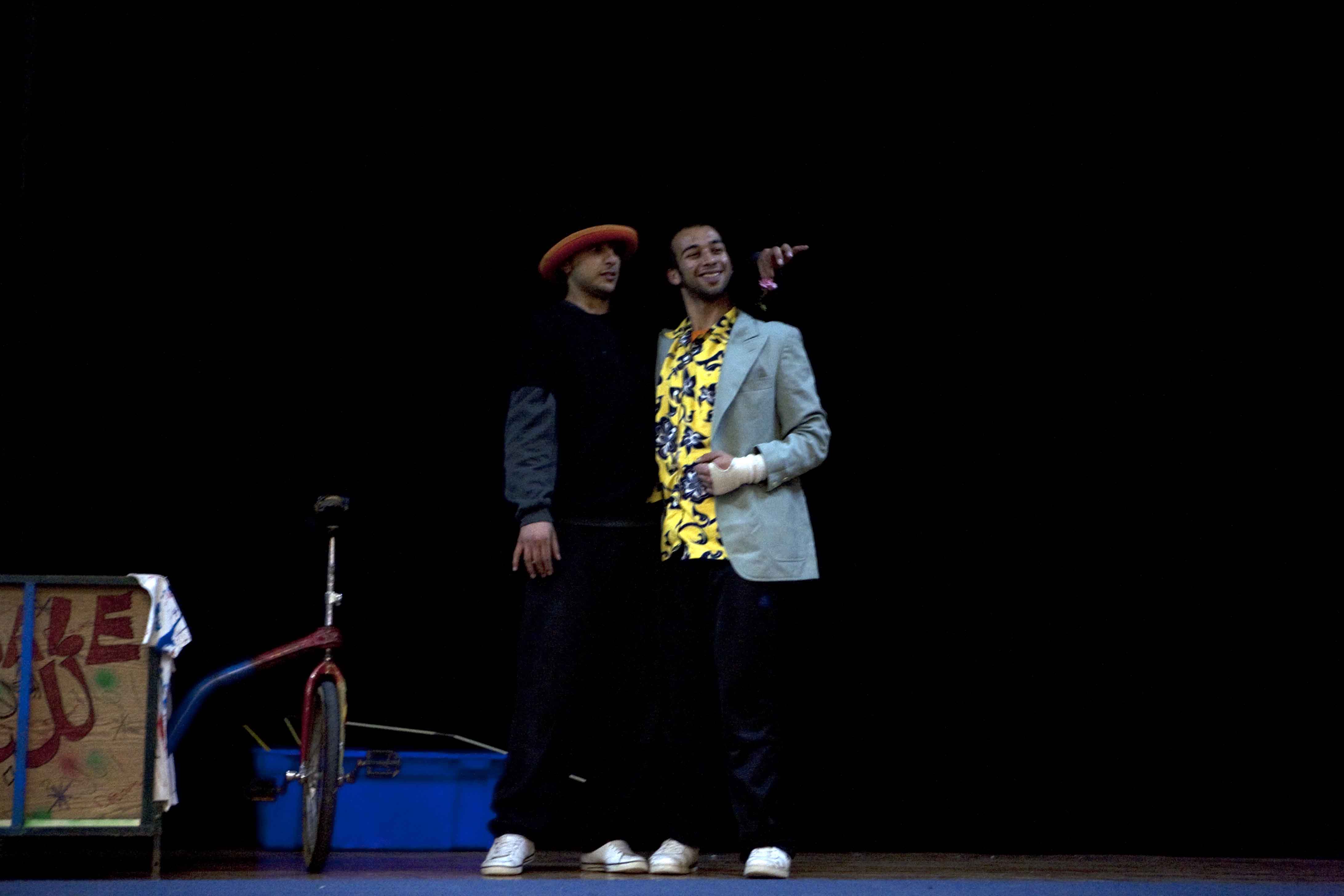 A colour photograph capturing a glimpse of the Palestinian Circus School's show, 'Dream for Sale', their 3rd production in 2010, at Saint Joseph School in Ramallah. Actors: Ahmad abu Taleb, Muhammad abu Taleb, Muhammad abu Sakha, Nur abur-rab; Directors and Trainers: Jack Jaxx, Séverine Bellini, Krista Fatka, Nayef ʿuthman, and Tomas Sokolowicz; Costumes and décor by: Ramy ʿarda.