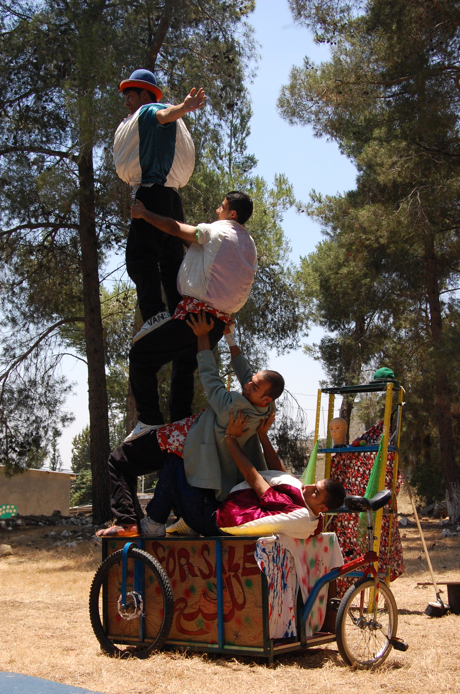 A colour photograph of the "Dreams for Sale" production performed by the Palestinian Circus School, at the Star Mountain Center. "Dreams for Sale" is the Palestinian Circus School's third production, created in 2010.