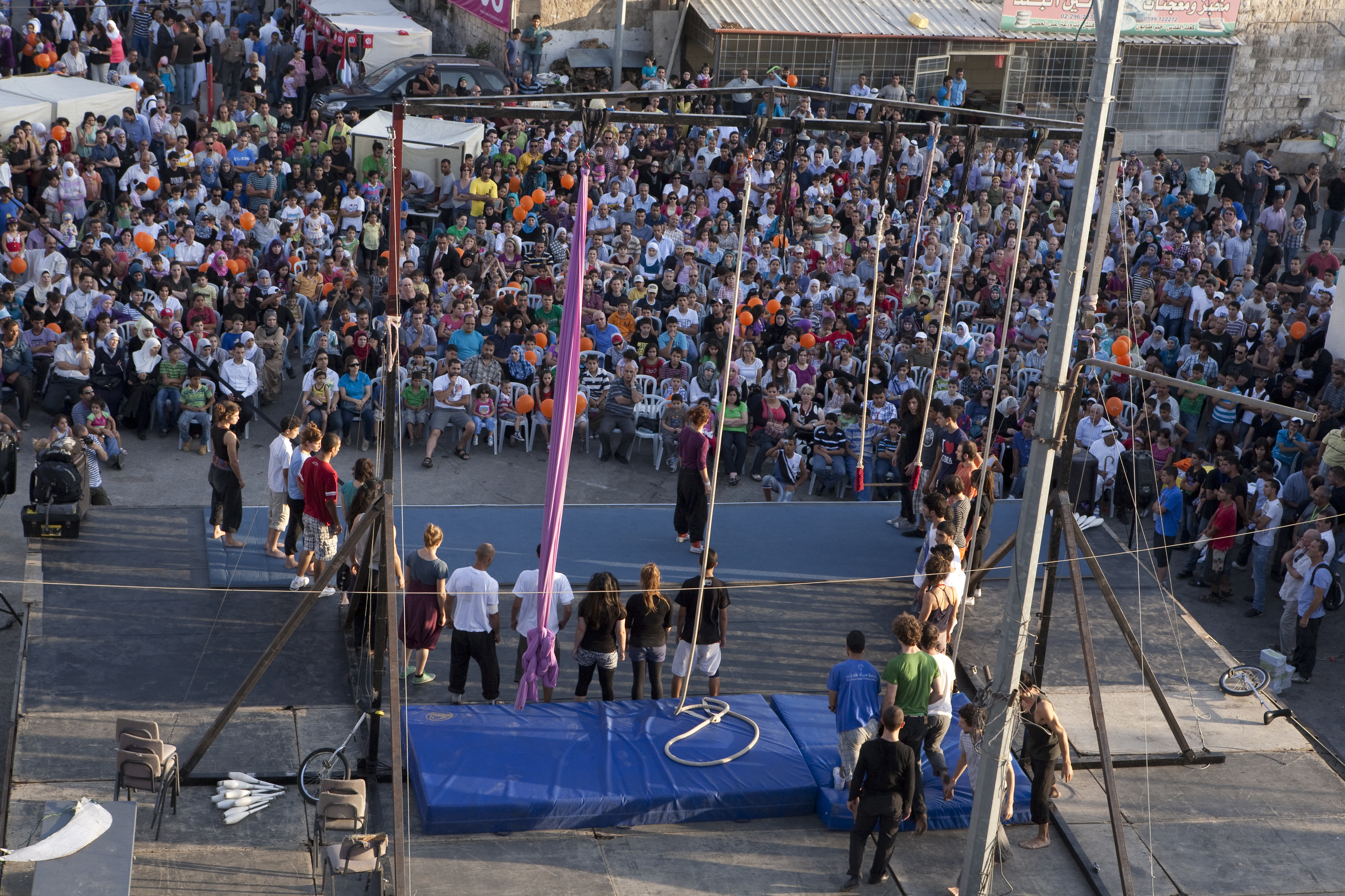 صورة ملونة لجولة السيرك المتنقل لمدرسة سيرك فلسطين.