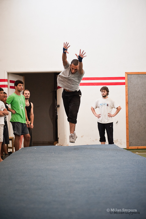 صورة ملونة تظهر جانبًا من تدريبات المدرسة الصيفيّة التابعة لمدرسة سيرك فلسطين عام 2011.