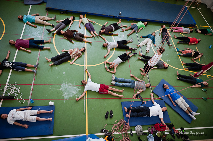 صورة ملونة تظهر جانبًا من تدريبات المدرسة الصيفيّة التابعة لمدرسة سيرك فلسطين عام 2011.