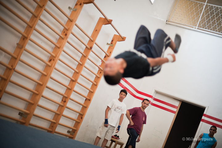 صورة ملونة تظهر جانبًا من تدريبات المدرسة الصيفيّة التابعة لمدرسة سيرك فلسطين عام 2011.