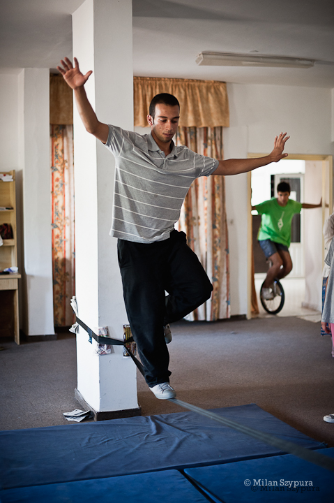 صورة ملونة من الدوام الصيفي لمدرسة سيرك فلسطين.;صورة ملونة ترصد ملمحاً من مدرسة سيرك فلسطين خلال مدرسة صيفية.