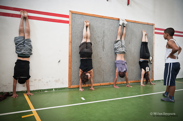 صورة ملونة تظهر جانبًا من تدريبات المدرسة الصيفيّة التابعة لمدرسة سيرك فلسطين عام 2011.