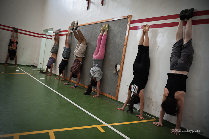 صورة ملونة تظهر جانبًا من تدريبات المدرسة الصيفيّة التابعة لمدرسة سيرك فلسطين عام 2011.
