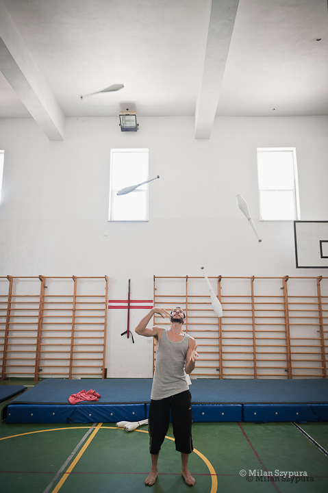 صورة ملونة تظهر جانبًا من تدريبات المدرسة الصيفيّة التابعة لمدرسة سيرك فلسطين عام 2011.