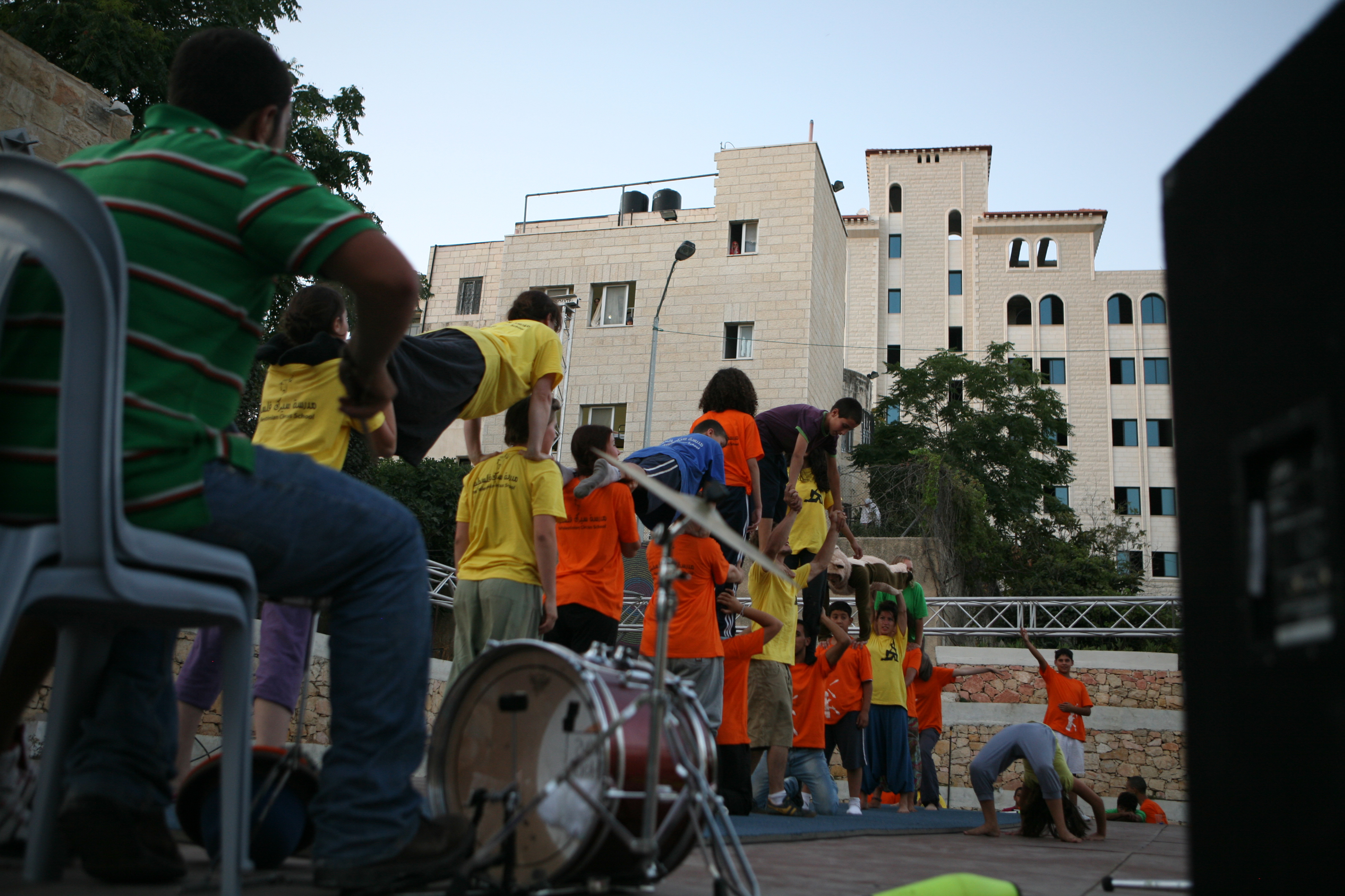 صورة ملونة من عرض لمدرسة سيرك فلسطين في مهرجان "وين ع رام الله".