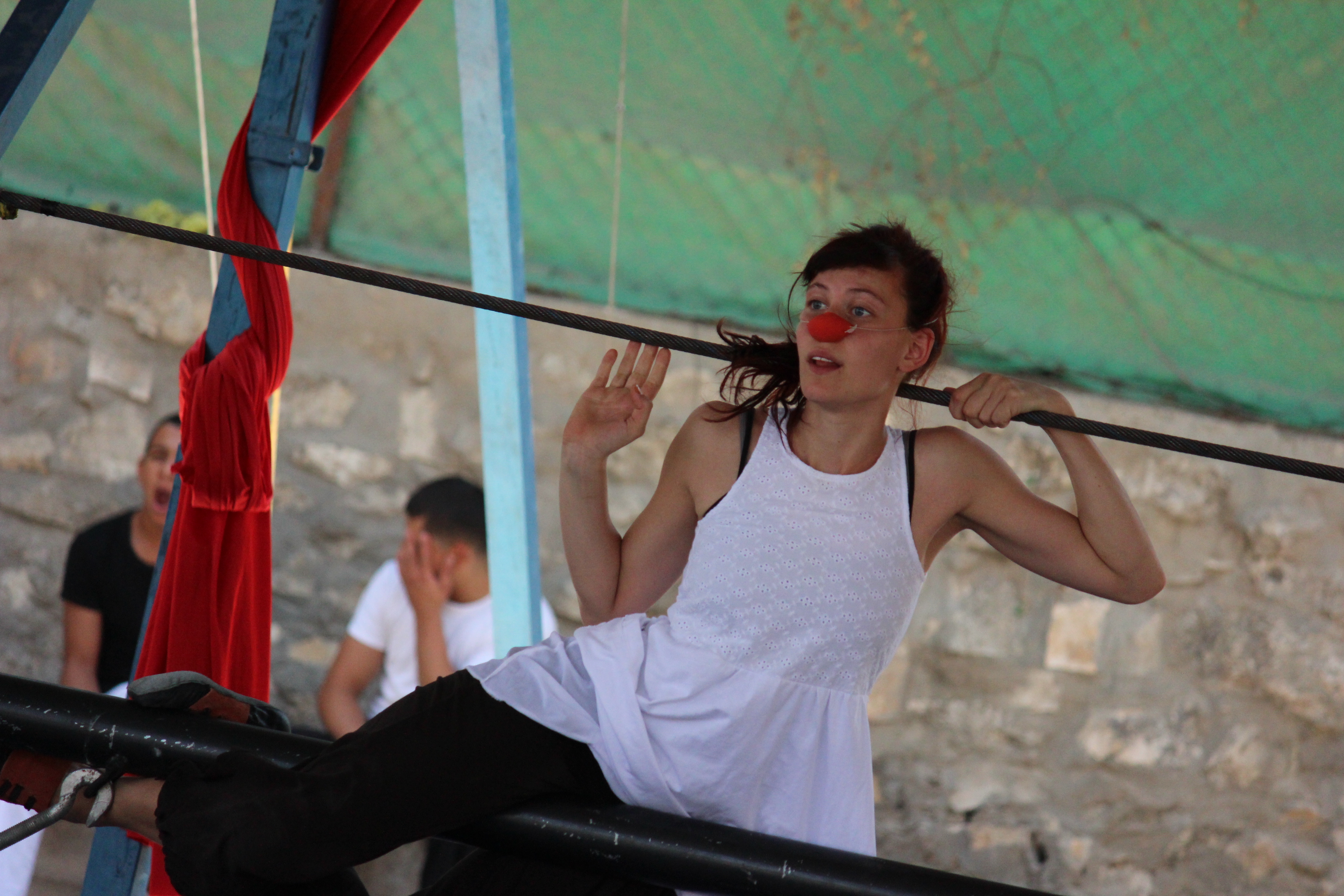 صورة ملوَّنة، التُقطت عام 2012، ترصد جانبًا من مدرسة صيفيَّة نظمتها مدرسة سيرك فلسطين في بلدة بيرزيت شماليّ مدينة رام الله المحتلَّة.