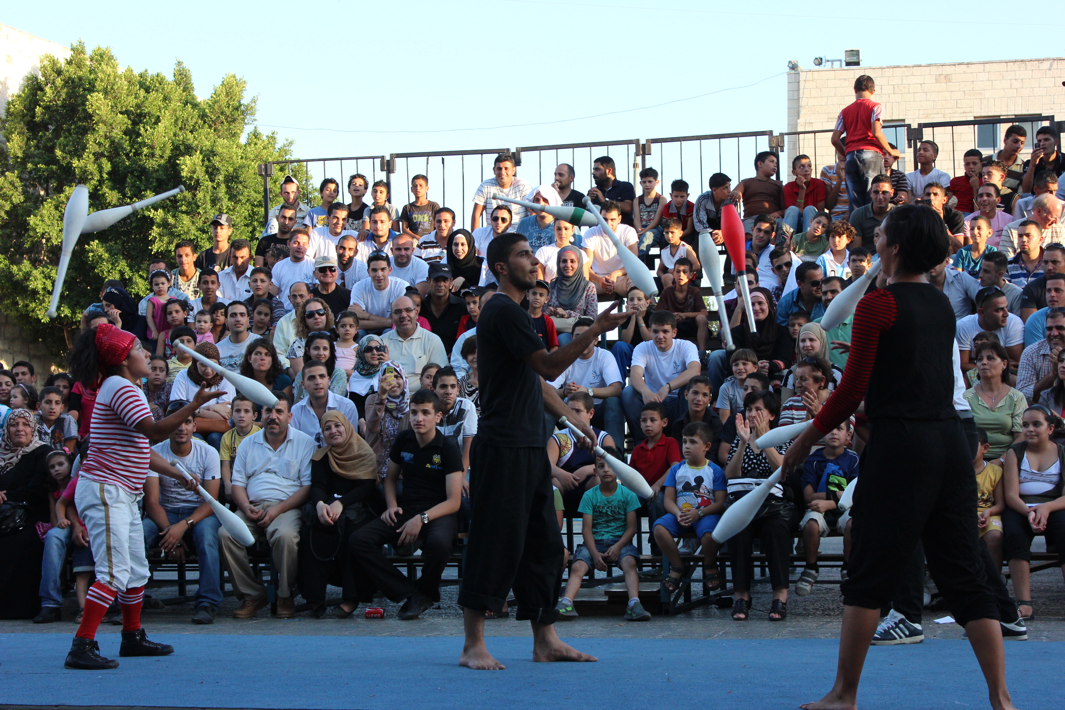 Taken in 2012, this is a colour photograph of a summer school that was organised by the Palestinian Circus School (PCS) in Birzeit, north of Israeli-occupied Ramallah.