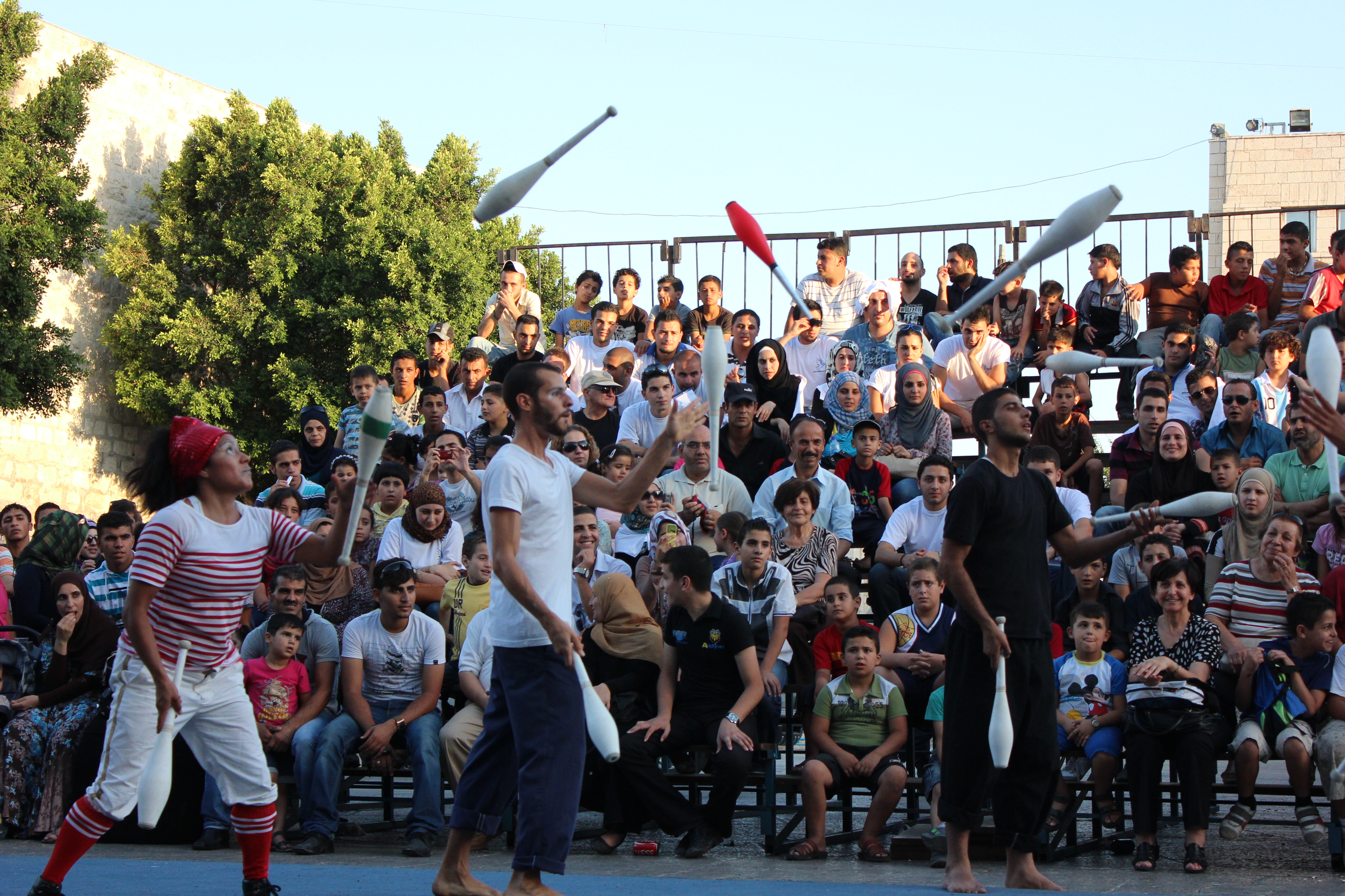 Taken in 2012, this is a colour photograph of a summer school that was organised by the Palestinian Circus School (PCS) in Birzeit, north of Israeli-occupied Ramallah.