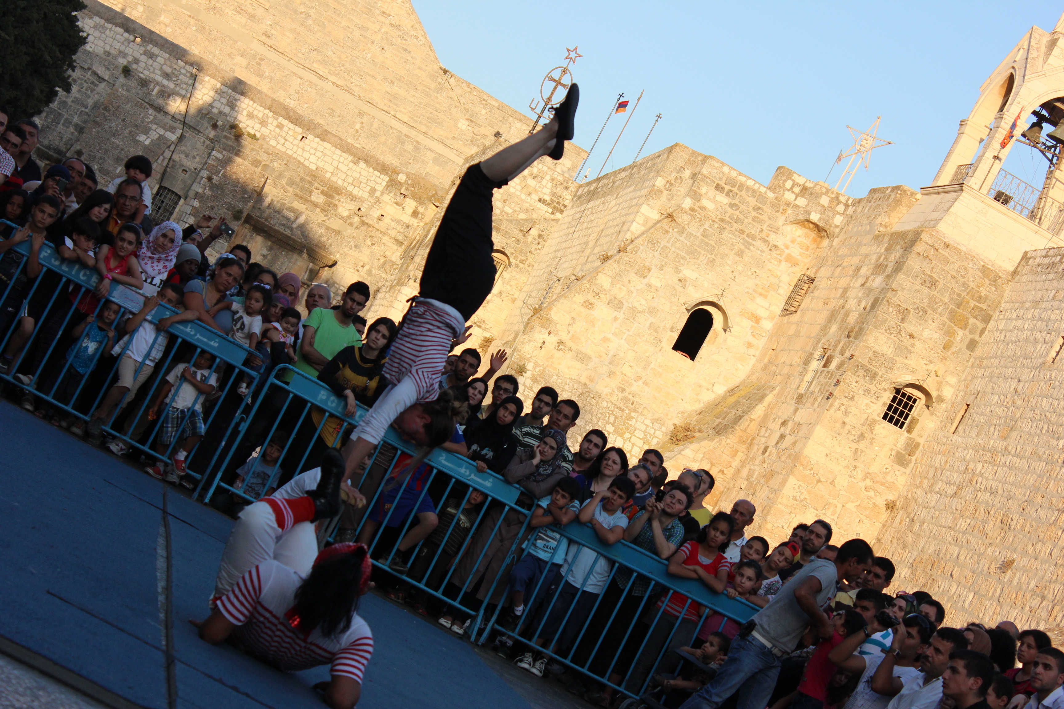 صورة ملوَّنة، التُقطت عام 2012، ترصد جانبًا من مدرسة صيفيَّة نظمتها مدرسة سيرك فلسطين في بلدة بيرزيت شماليّ مدينة رام الله المحتلَّة.