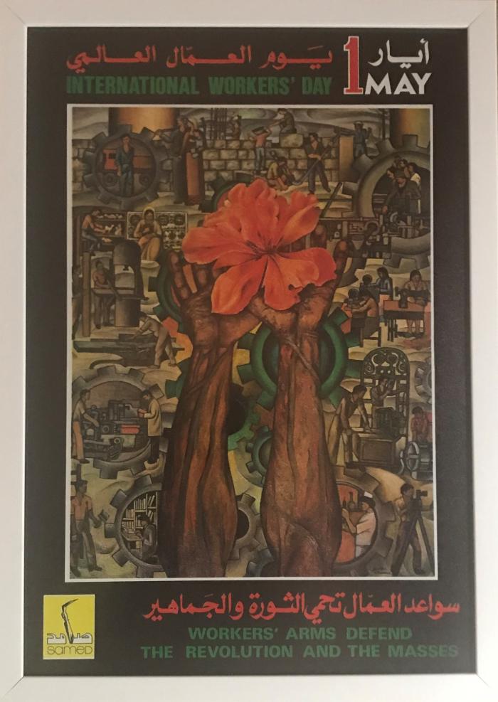 ملصق بعنوان "يوم العمال العالمي" صادر عن جمعية معامل أبناء شهداء فلسطين (صامد) عام 1980.