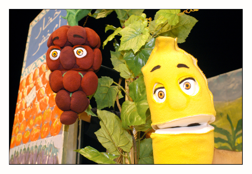 صورة ملونة من عرض مسرحية "مغامرات خضرا" في مسرح وسينماتك القصبة، شارك في تمثيلها: حسام أبو عيشة، دورين منير، ورجائي صندوقة.