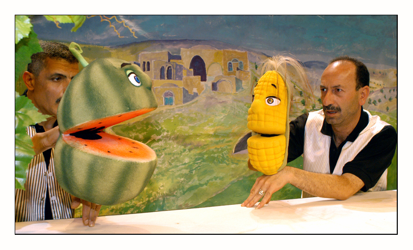 صورة ملونة من عرض مسرحية "مغامرات خضرا" في مسرح وسينماتك القصبة، شارك في تمثيلها: حسام أبو عيشة، دورين منير، ورجائي صندوقة.