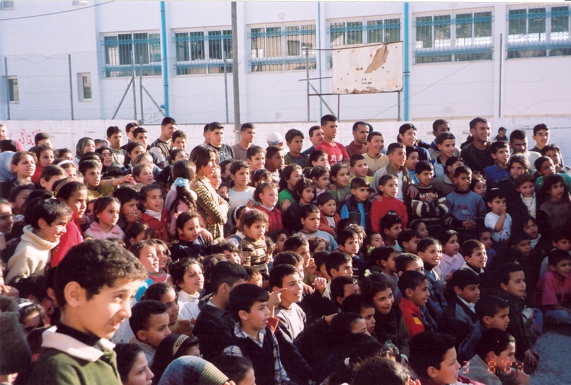 صورة ملونة من عرض مسرحي للأطفال لمسرح وسينماتك القصبة في مخيم الفارعة لللاجئين.