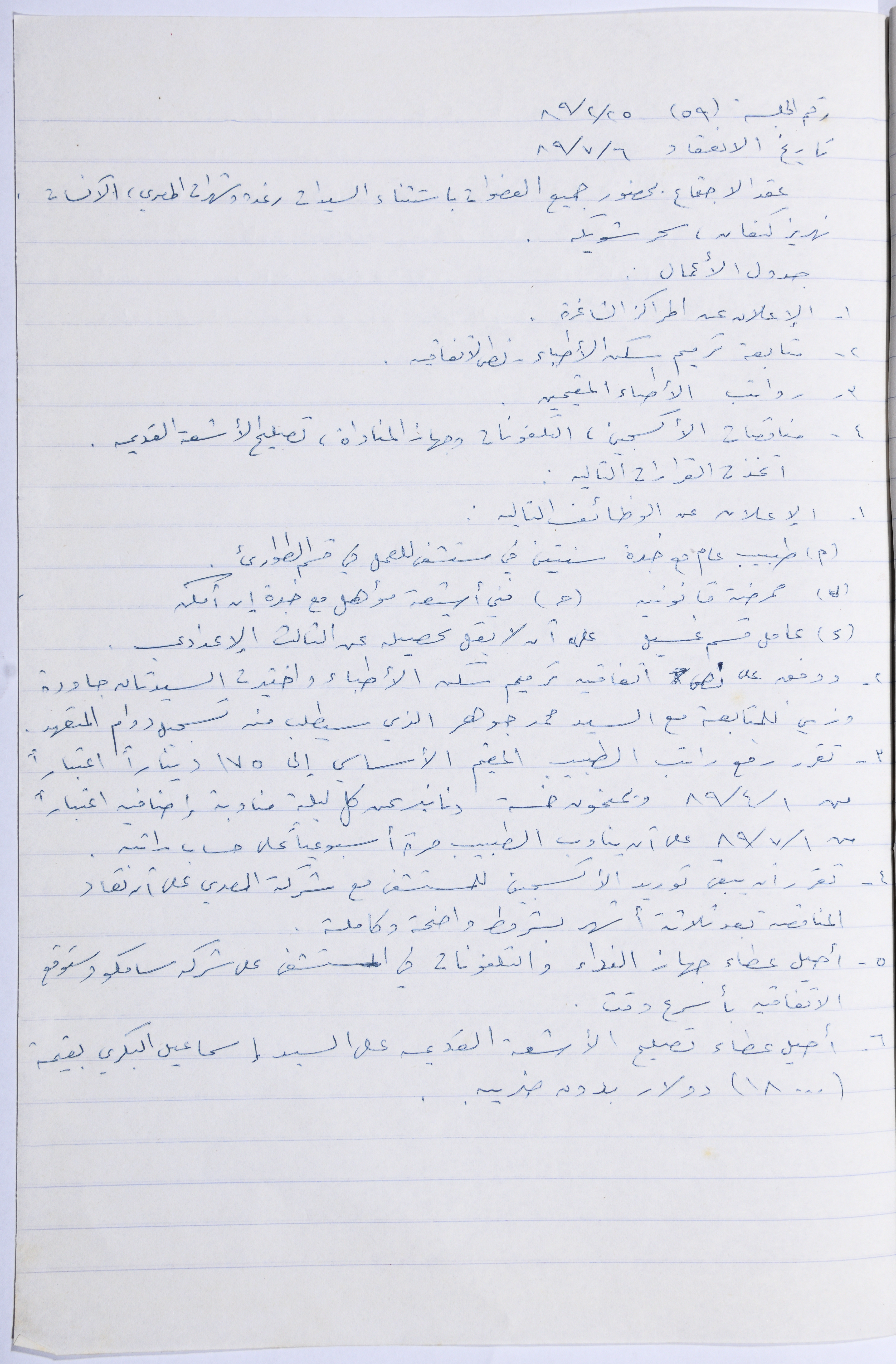 Held on 6 July 1989, this document shows the minutes of a meeting of the administrative body of the Arab Women Union Society in Nablus.