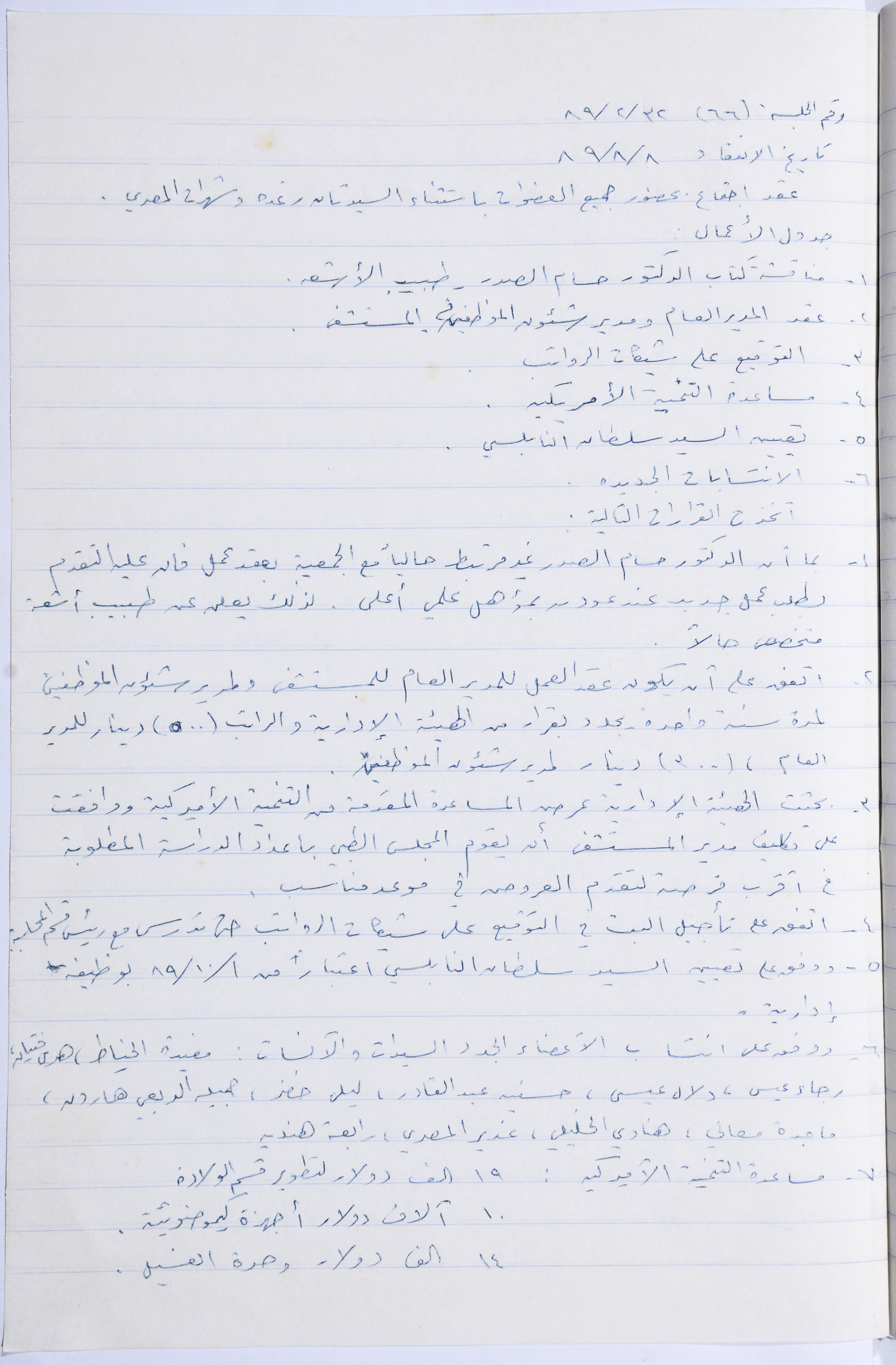 Held on 8 August 1989, this document shows the minutes of a meeting of the administrative body of the Arab Women Union Society in Nablus.