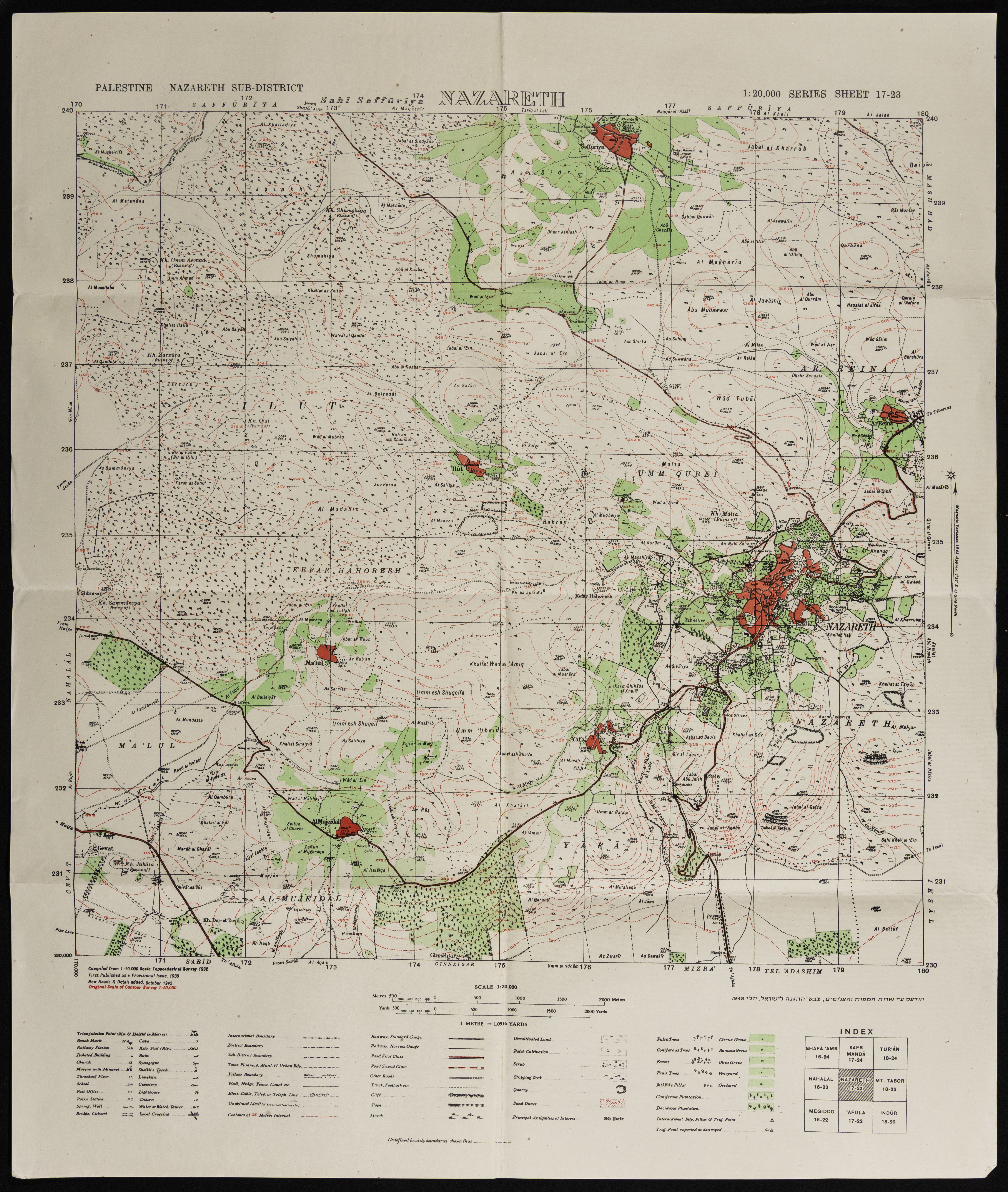 A map showing borders, roads, sacred places, topographical nature of hills, plains, slopes, natural landscape, and planting types. The map was published during the British Mandate, and was modified by the Maps and Images Service of the Israeli Military Forces in the 1940s.